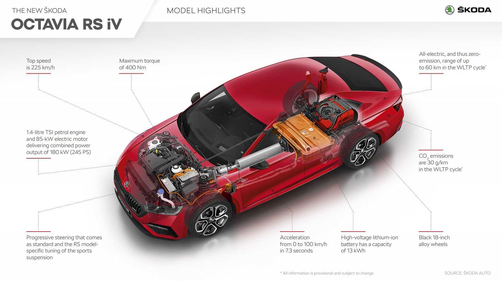 Ядром и главным источником энергии RS iV является бензиновый двигатель 1.4 TSI мощностью 150 л.с. В паре с ним работает гибридная 6-ступенчатая коробка передач DSG со встроенным 85-киловаттным электромотором, который питается от расположенной под задним сиденьем литий-ионной батареи ёмкостью 13 кВт·ч. Блок силовой электроники уместился под капотом, а топливный бак (40 л) занял место над задней подвеской, «съев» часть объёма багажника: у лифтбека он уменьшился с 600 до 450 л, у версии Combi – с 640 до 490 л.