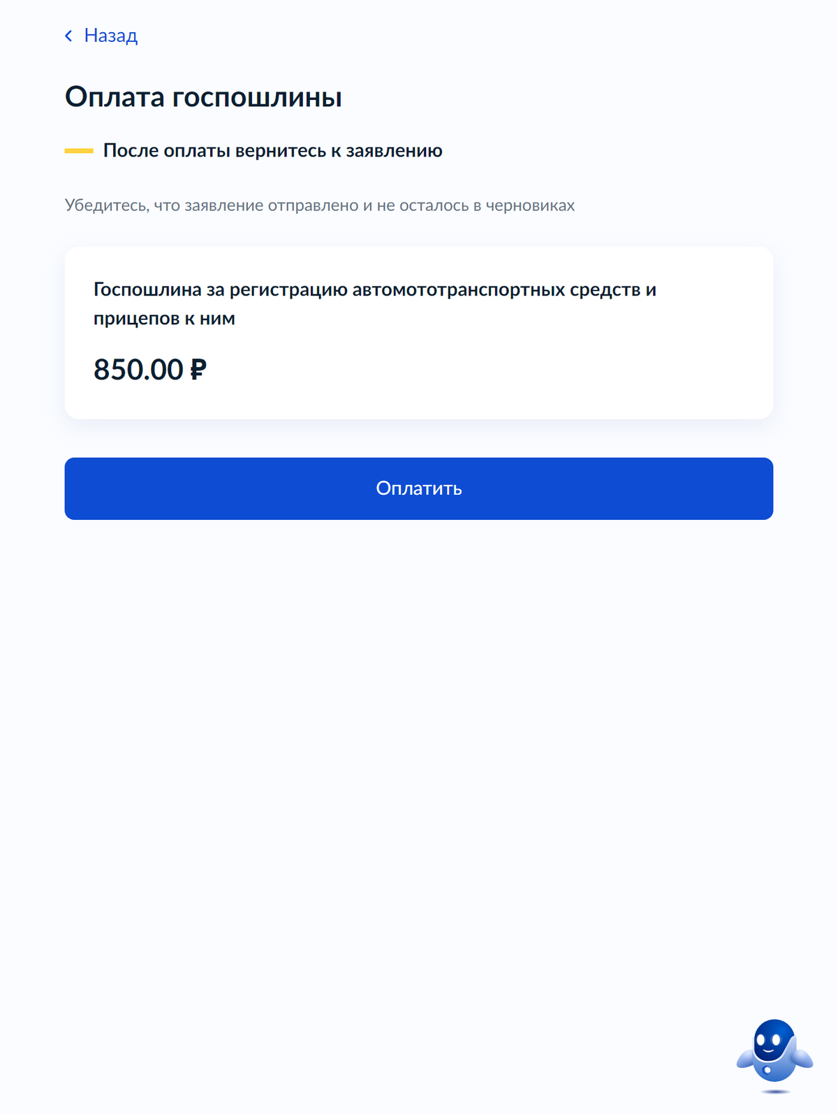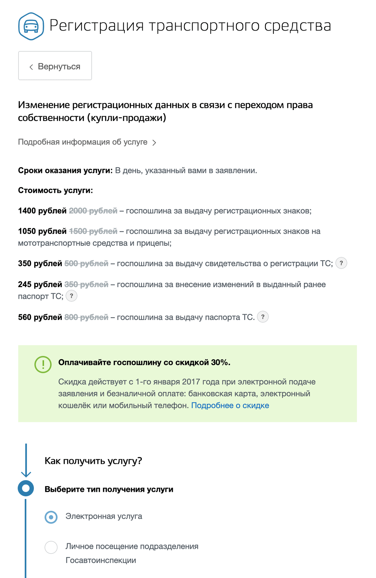 Все автовладельцы, которые подадут заявление на регистрацию ТС через Госуслуги, получают 30% скидку на оплату пошлин. Так, стоимость постановки на учет новой машины со скидкой составит 1995 руб. Оплатить госпошлину можно через мобильный платеж, электронный кошелек или банковскую карту.