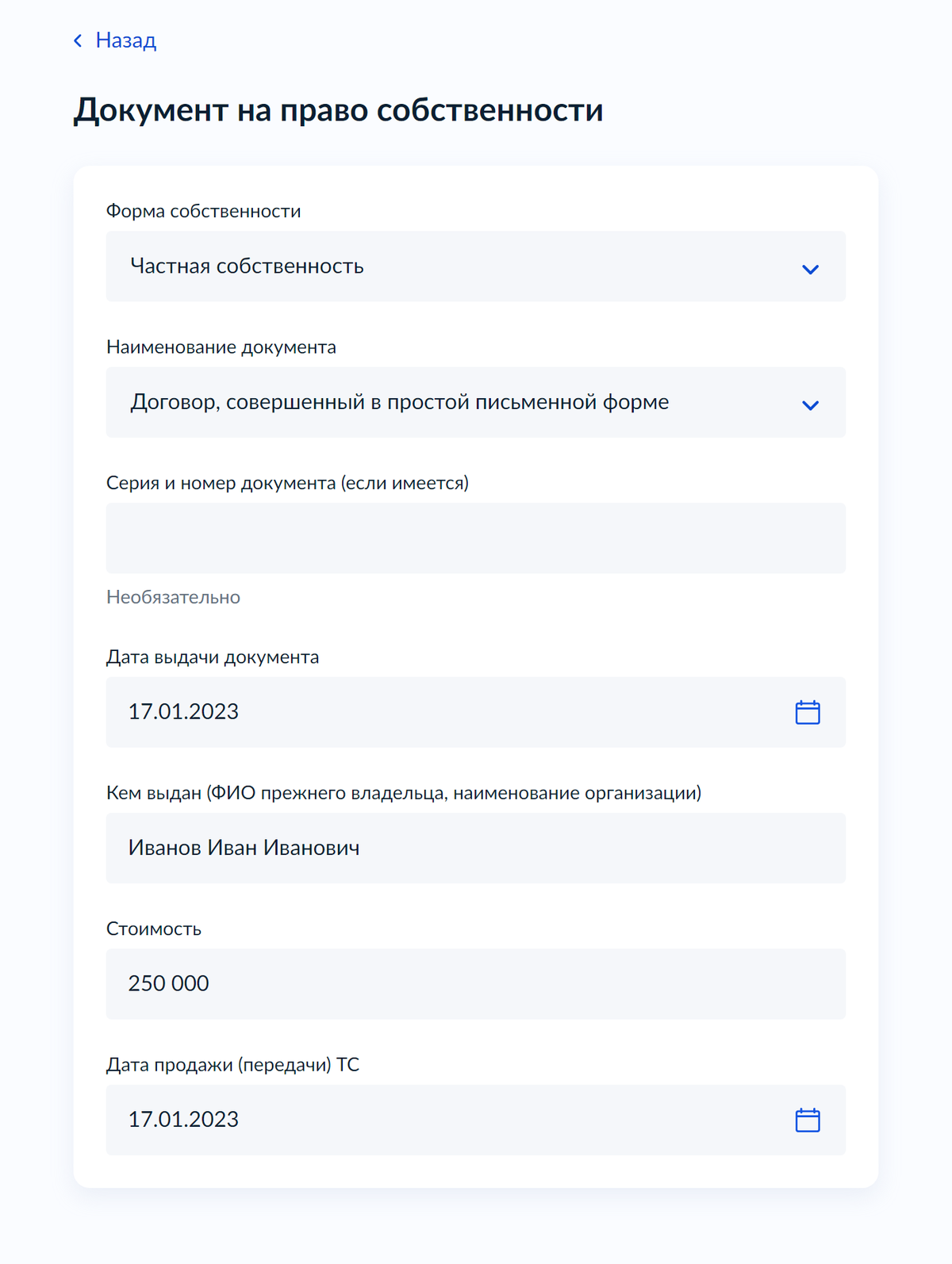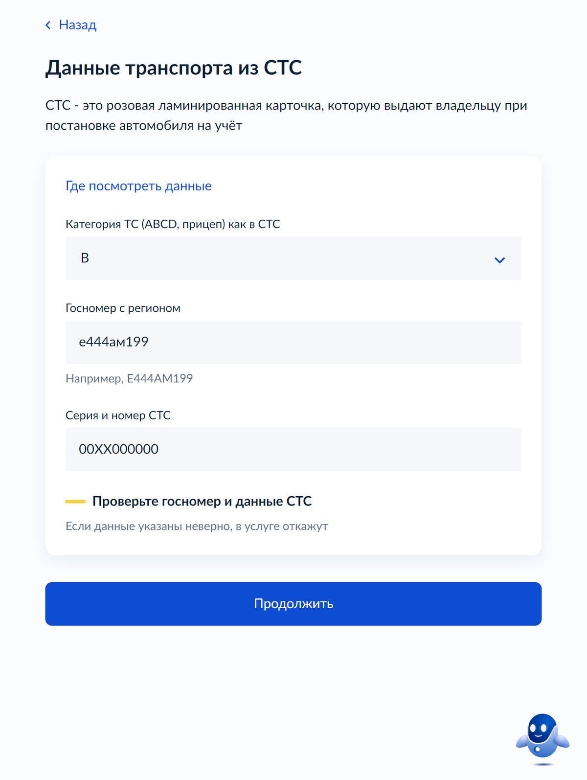 2. В результате действий в пункте 1 Вам откроется форма для заполнения данных об автомобиле и собственнике. Здесь мы не будем инструктировать по очевидным элементам формы, а отметим те, в которых у Вас могут возникнуть вопросы.
