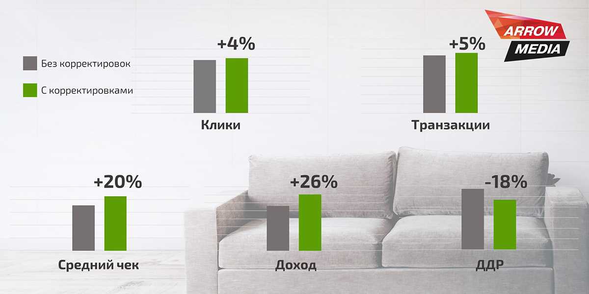 Чтобы проверить гипотезу, мы запустили тест. Кампания с корректировками по полу и возрасту принесли клиенту больше трафика и рост среднего чека, как следствие, увеличился доход с сокращением ДРР. Это произошло из-за перераспределения аудитории: реклама стала чаще показываться пользователям с большей покупательской платежеспособностью в сети.