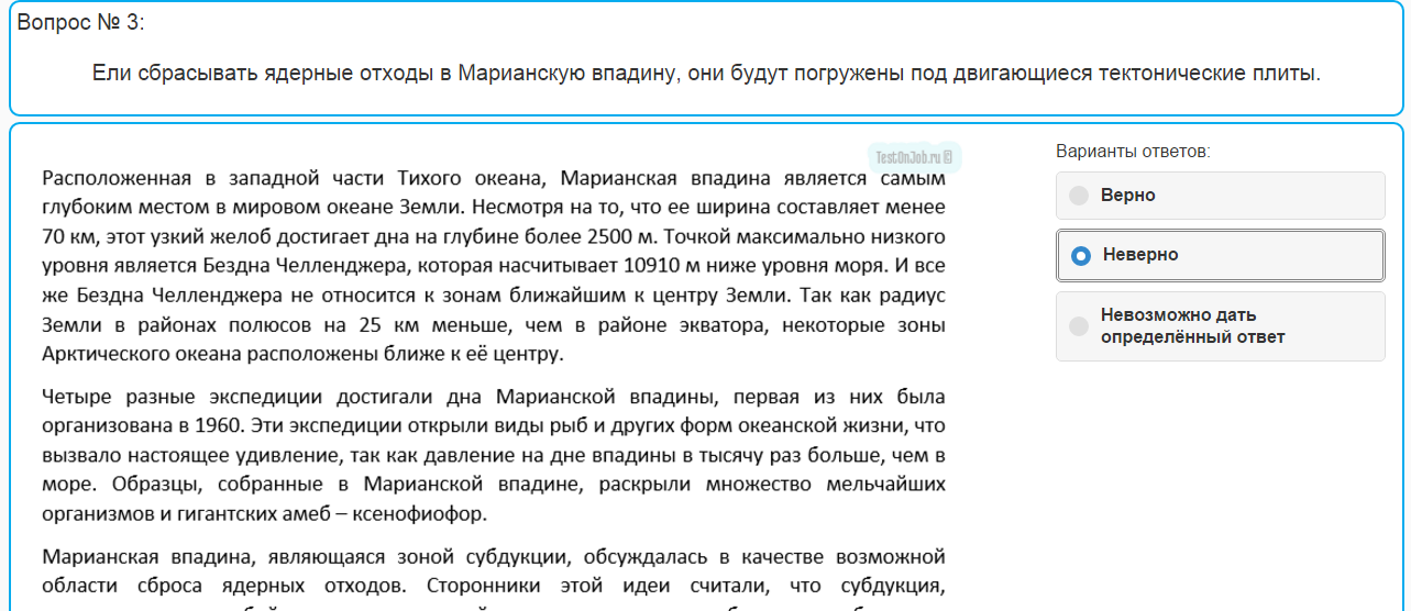Вербальный тест SHL более сложен даже для подготовленных соискателей, а если с ним столкнуться впервые, провал практически гарантирован. Вкратце вербальная задача – это небольшой текст о каком-либо явлении, событии и т. д. Ниже идет 2-3 утверждения, связанные с текстом, которые следует отметить как «истинные», «ложные», «мало информации». Смысл задания в том, чтобы претендент смог быстро прочесть текст, понять логические связи и дать ответ. Сложность в том, что ответ «нет информации» часто похож на «ложь» или «правду» и научиться чувствовать разницу можно только после многих тренировок.