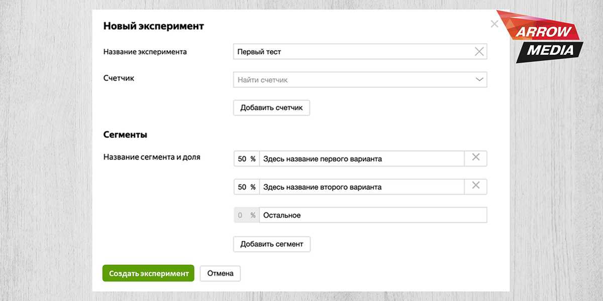 В настройках каждой кампании необходимо привязать соответствующий сегмент «Эксперимента».