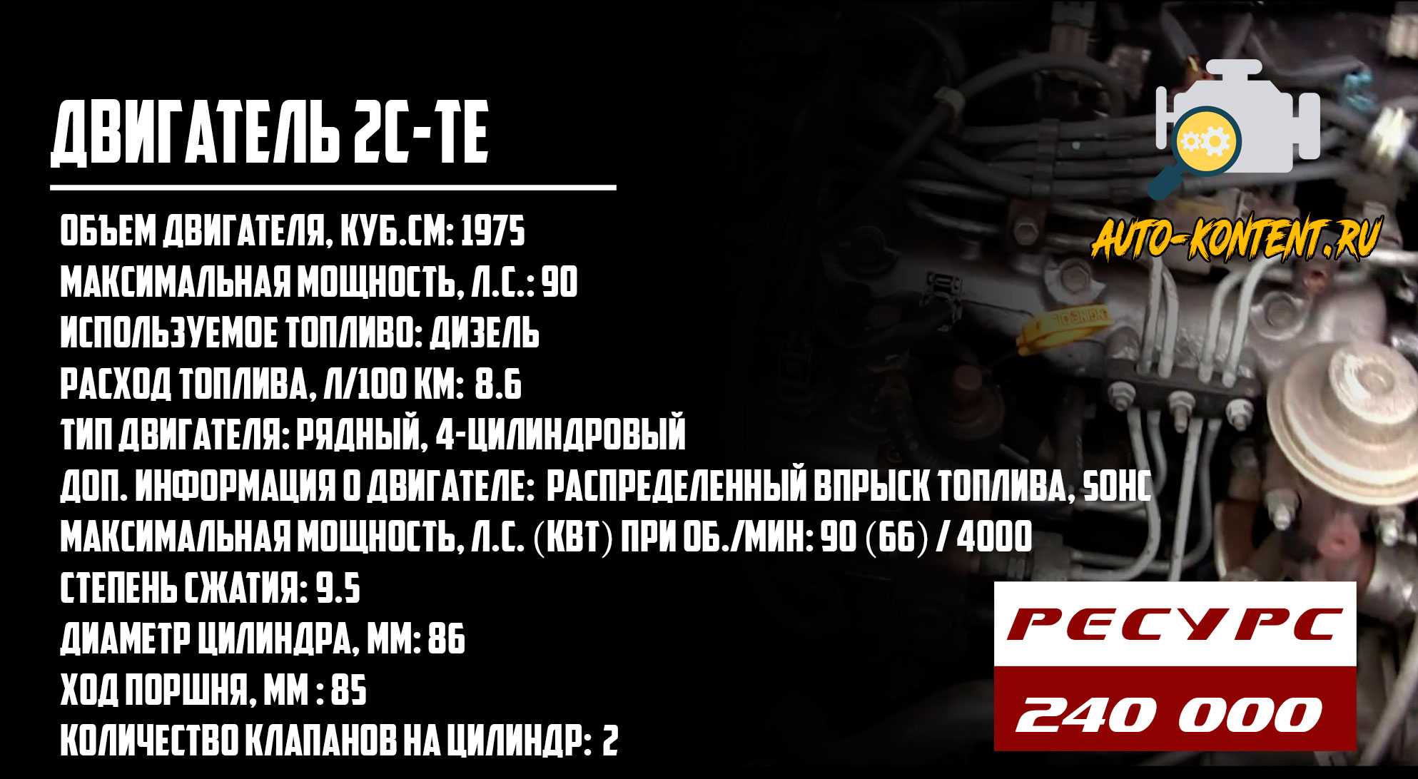 Двухлитровый дизельный мотор 2C-TE собирался всего 3 года. Мотор ставили только на дорестайлинговую версию Авенсис для европейского рынка. Силовой агрегат с форкамерой, одновальная головка блока цилиндров SOHC, ремень в приводе газораспределительного механизма, фазорегуляторы отсутствуют, как и гидрокомпенсаторы, но есть турбина. Блок цилиндров рядный чугунный, головка алюминиевая 8-клапанная.