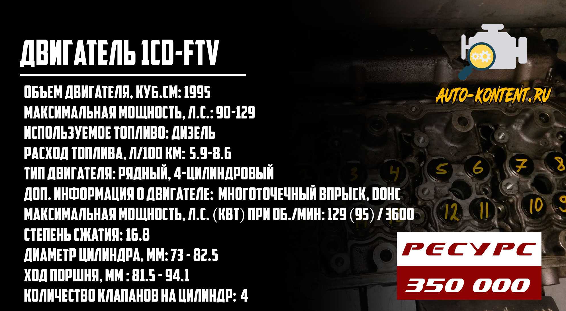 Двигатель радует неплохим соотношением мощности и расхода топлива. Если лить проверенное топливо, то 1CD-FTV не будет доставлять особых проблем. Единственная проблема для российских автомобилистов в том, что в России проблематично найти к нему запасные части. В Европе ассортимент запчастей довольно обширный. Практически во всех модификациях ДВС отсутствует FAP-фильтр, что можно также считать плюсом. Однако 1CD-FTV чувствителен в отношении качества топлива. Если выходит из строя топливная аппаратура, в частности форсунки Denso, придется покупать новый комплект – форсунки практически не подлежат восстановлению. Недостаток мотора еще и в том, что отсутствуют ремонтные размеры блока цилиндров. Отдельные запчасти стоят действительно дорого. Гарантированный ресурс – 200 тыс. км, но на практике он ходит больше, примерно в 1.5 раза. Мотор нельзя назвать крайне надежным, у него есть несколько врожденных болезней: ненадежная водяная помпа, быстро загрязняется клапан системы ЕГР, часто выходит из строя датчик давления масла, и, как было сказано выше, доставляют проблемы топливные форсунки.
