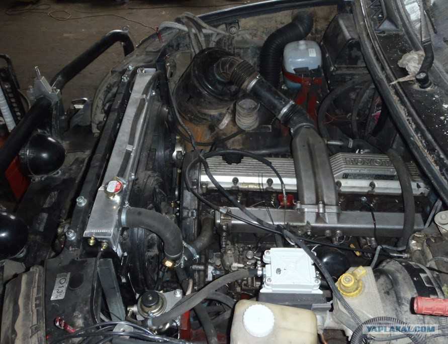 Время поджимало, поэтому ставили мотор не совсем правильно, дело в том, что двигатель очень длинный, соотно пару цилиндров надо было задвигать в салон, при этом попилить шит и сварить короб это не прблемма, а вот перепилить печку, и чтоб работала, уже сложнее, кроме того, если ставить по уму, придётся перепиливать и две поперечины кузовные, в общем времени на это не было, поэтому когда мотор встал, места по радиатор осталось крайне мало, ну а замок капота пришлось просто выкинуть, кроме того, т.к.радиатор стоял очень близко к мотору, использовать родную виско муфту было не реально, пришлось эксперементировать с карлсонами, скажу на перед — все эксперименты успехом не увенчались, но я таки победил !
