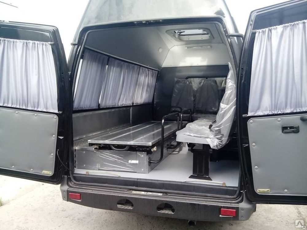 Важно, чтобы для удобства погрузки и выгрузки гроба сзади была предусмотрена отдельная большая дверь с широким радиусом открывания. Обычно такие машины изготавливают на базе фургонов, так как именно этот тип кузова обеспечивает максимальный комфорт перевозки и специфического груза, и пассажиров