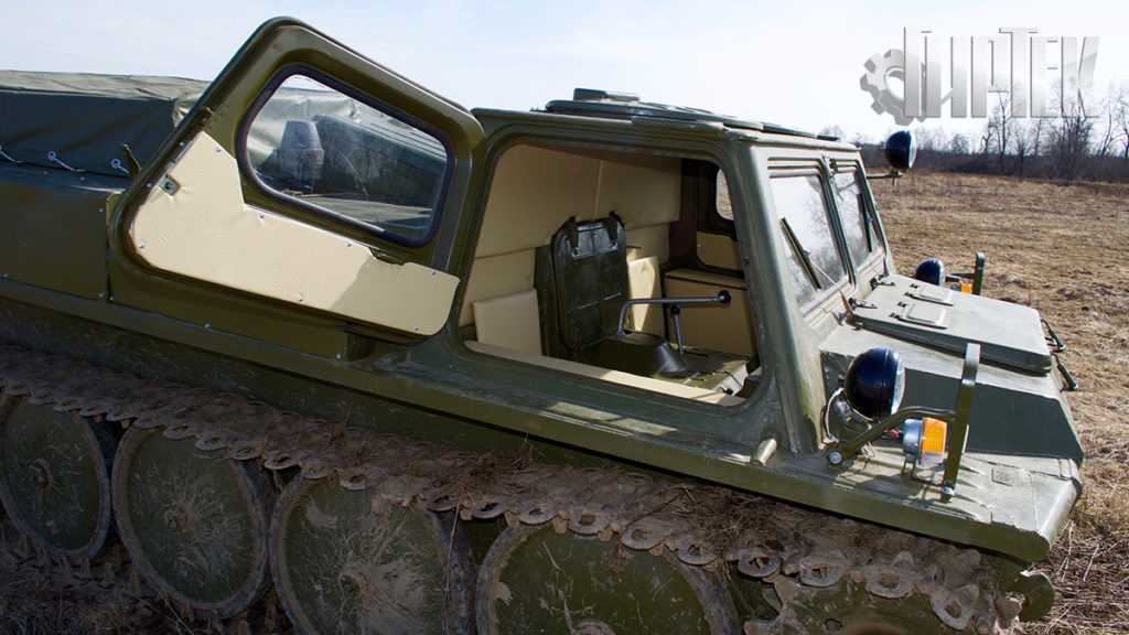 Кабина вездехода металлическая; Доступ к нему осуществляется через распашную дверь, установленную сбоку, или через люки в крыше. Внутри есть кресла на 10 человек, полумягкие кресла с откидной спинкой способствуют их удобному размещению.