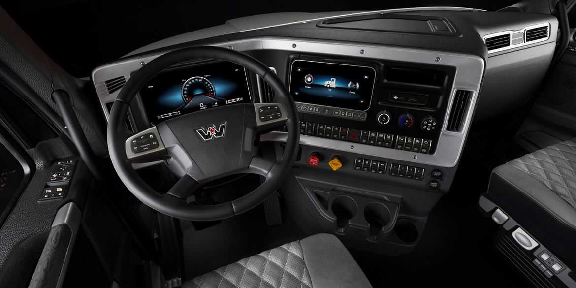 Перед водителем расположена 12-дюймовая цифровая приборная панель (на новом флагмане Western Star впервые отказалась от традиционных шкал) и дисплей мультимедийной системы диагональю 10 дюймов. Тягач оснащен широким набором вспомогательной электроники, который включает в себя адаптивный круиз-контроль (расстояние до впередиидущей машины обсчитывается с помощью отдельного лидара) с системой контроля полосы и функцией автоматической полной остановки и датчики контроля слепых зон.