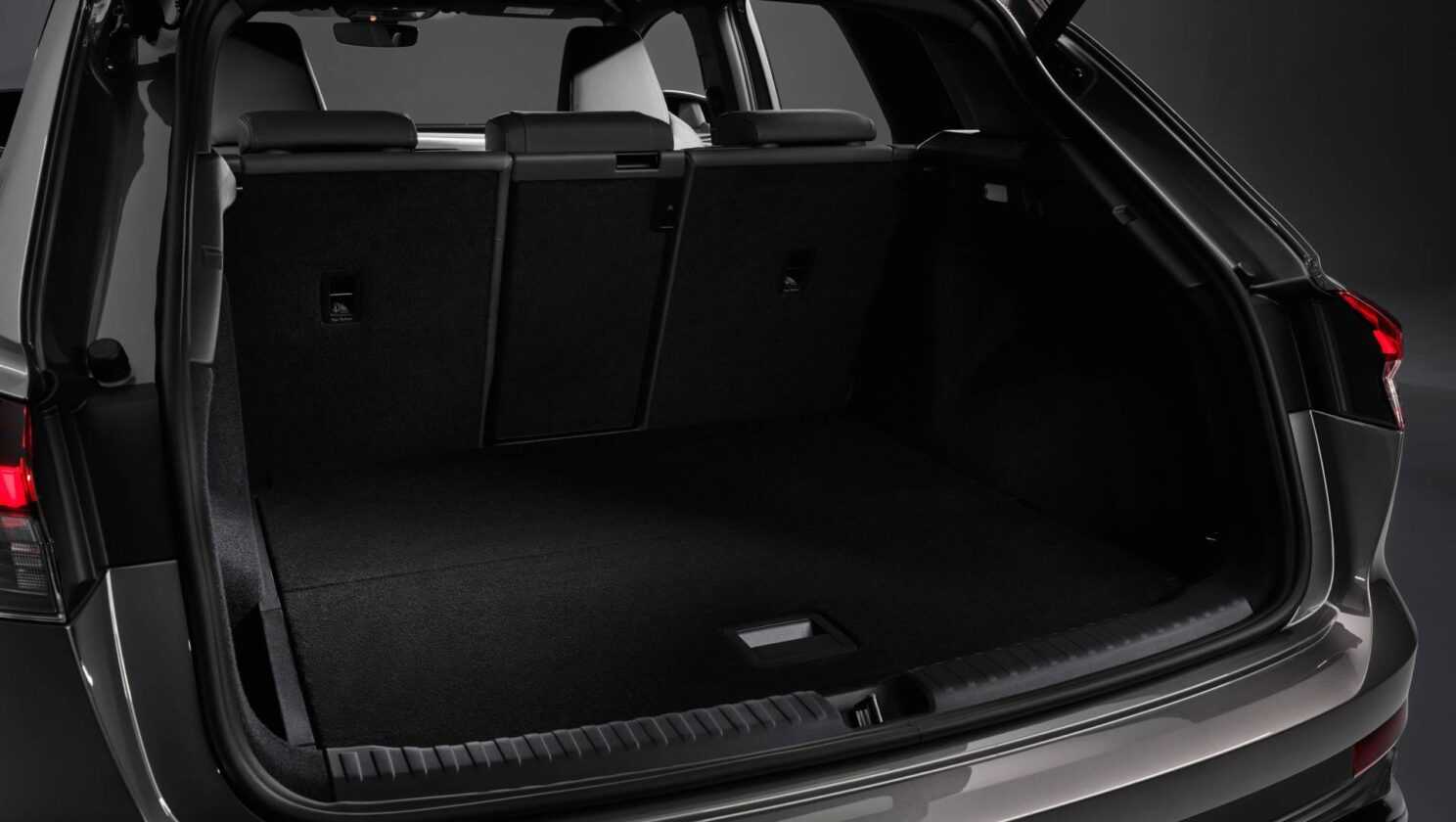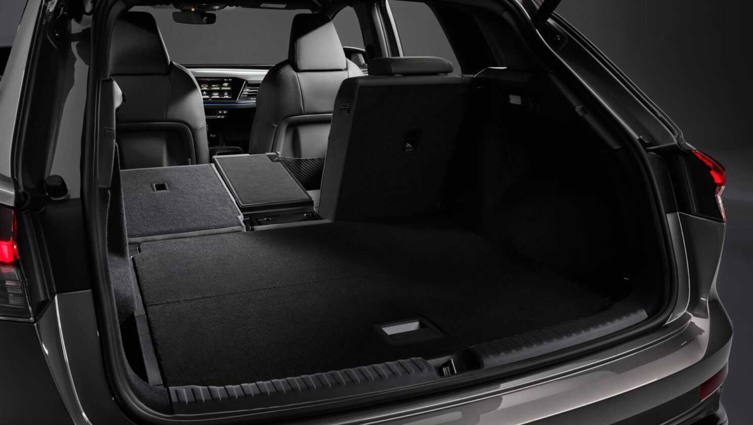 В электрическом Audi E-tron Sportback предусмотрено два багажных отделения. Под капотом разместился небольшой закрывающийся ящик на 60 литров. Объём заднего багажника 555 литров, а при сложении заднего ряда грузовое пространство увеличивается до 1595 литров.