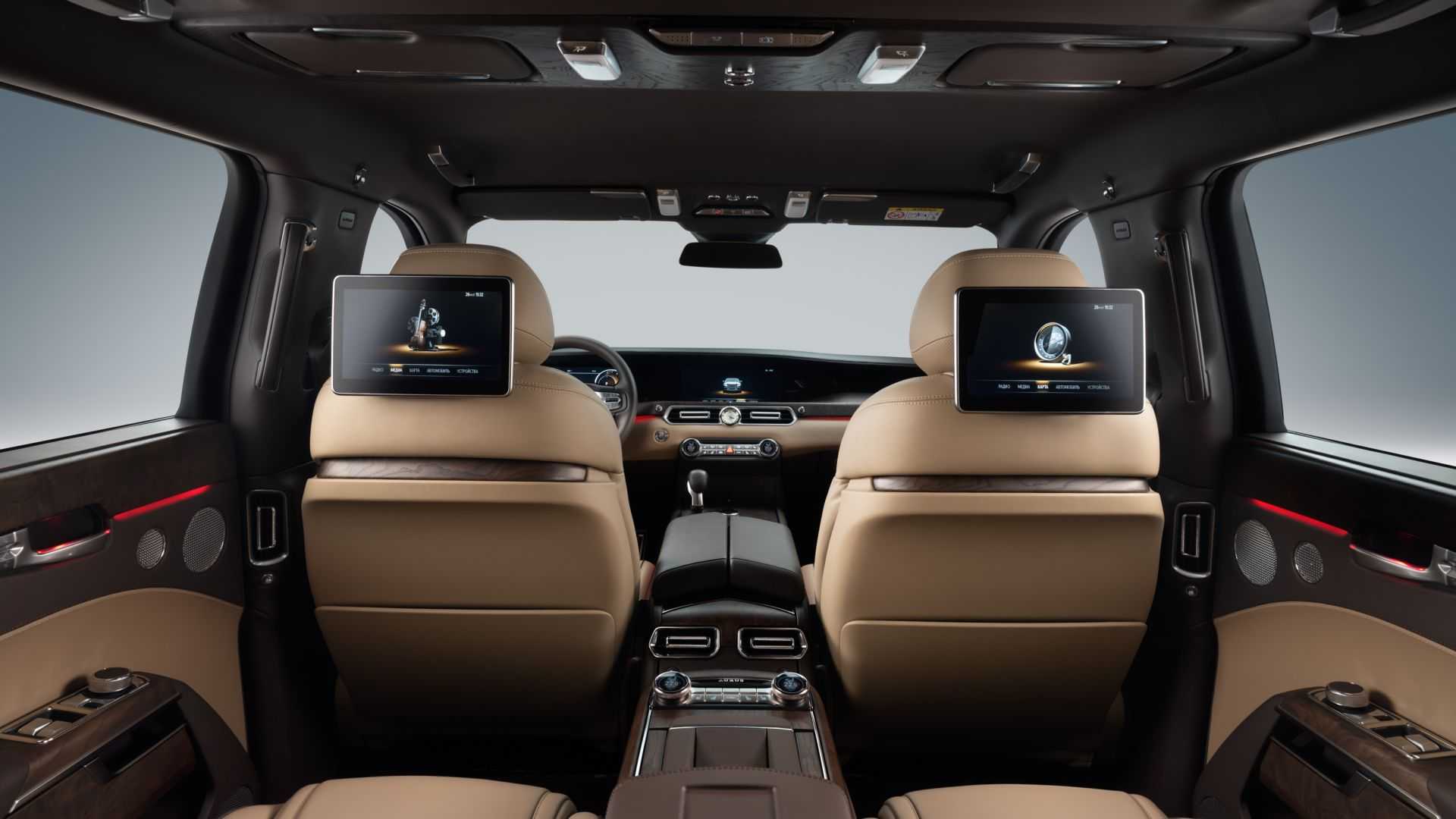 На передней панели перед водителем находится пара широкоформатных дисплеев, по центру консоли – аналоговые часы, а на блоке климатической системы располагаются шайбы со встроенными дисплеями. Уже в базе такое авто будет иметь столики, подлокотники с элементами управления мультимедийкой, двухзонный климат-контроль и небольшой холодильник для напитков.
