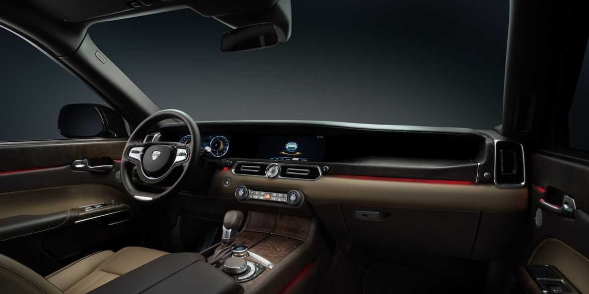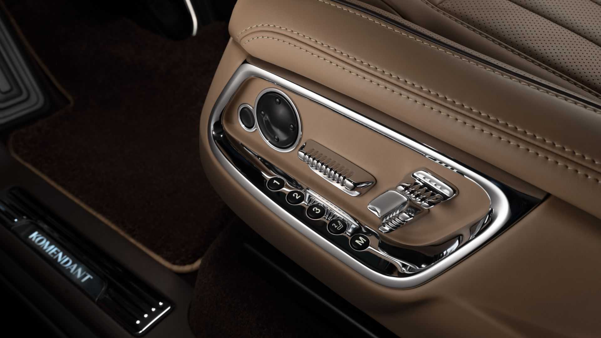 Komendant можно будет заказать как с раздельными задними креслами (с функциями массажа и вентиляции), так и с трехместным диваном, сложить который для перевозки длинномеров, однако, нельзя. Объем багажника – 600 л. В палитре цветов доступны два оттенка – медный и темно-изумрудный, – в которые не красят седаны.