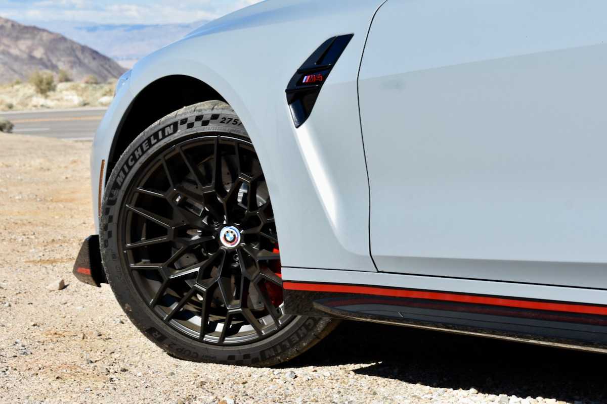 The M4 CSL is 8mm lower at both ends, and that’s mostly achieved via new springs that also dictated new mapping for the active dampers at each corner. One of the keys to the added (predicted) track pace is an enormous die-cast engine bay strut, to add rigidity to the front end’s ability to bite. The hollow strut bolts down in 11 places—so it’s a serious piece of hardware—and it even weighs 3 pounds less than the M4 Competition’s engine-bay strut.
