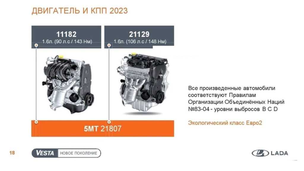 В мае 2023 планируется старт производства Весты NG с 16-клапанным мотором ВАЗ-21127 (106 л.с). При этом на начальном этапе двигатели будут соответствовать эко-нормам Евро-2. Допускается работа на 92 бензине (это можно увидеть слайде из материала презентации):