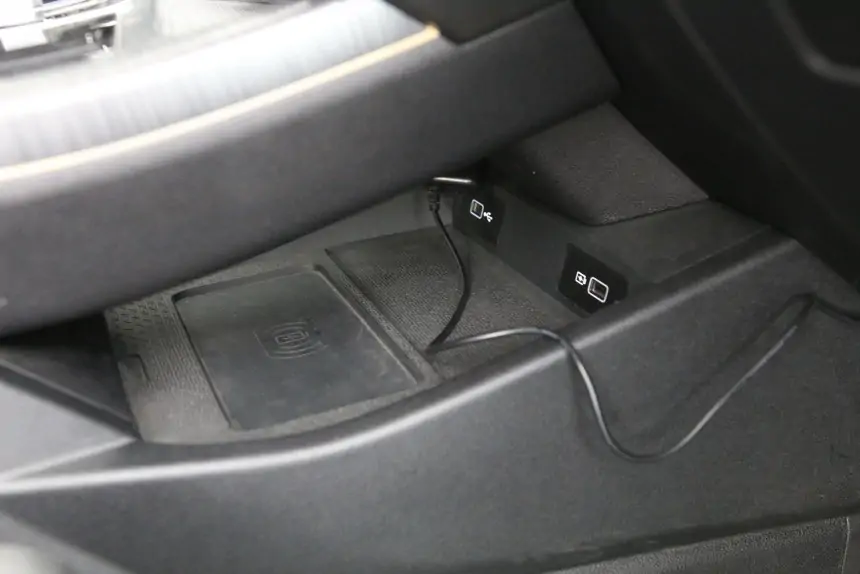 В Geely Tugella есть места для смартфонов. Да, во множественном числе, при этом на нижней полке присутствует беспроводная зарядка и два USB порта.