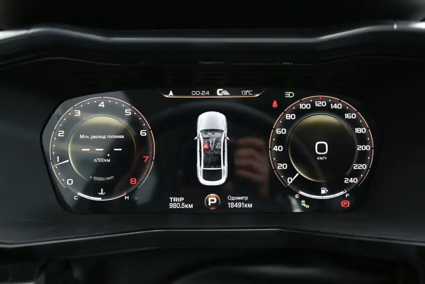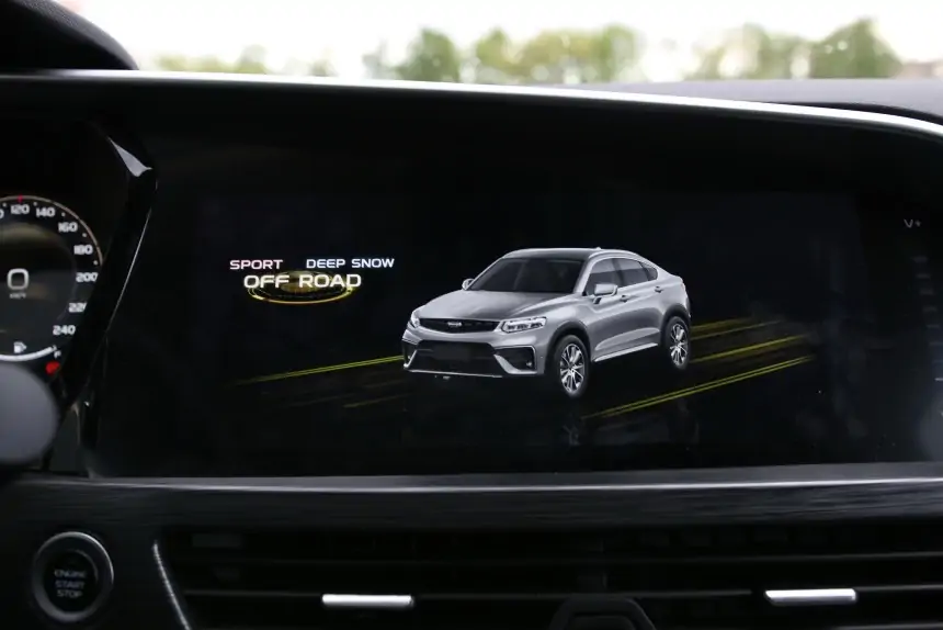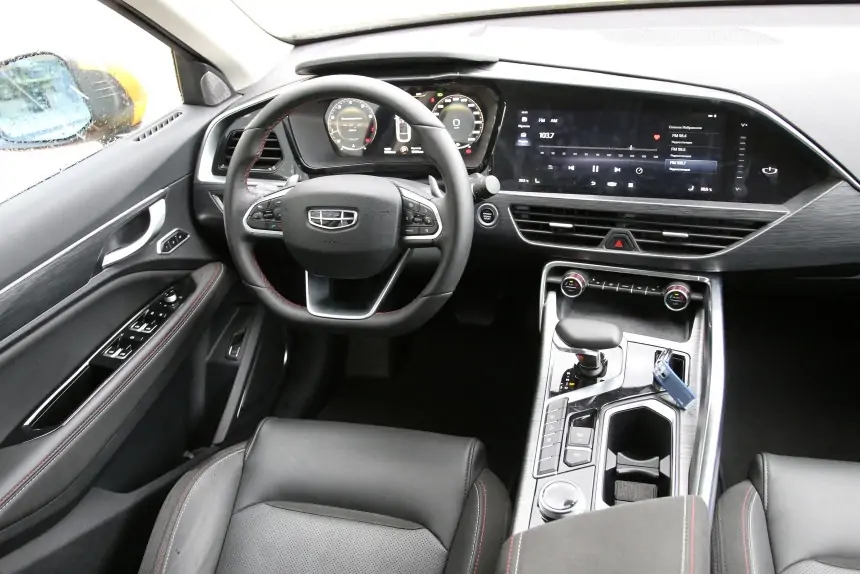 Путь неблизкий, около 200 километров в одну сторону, поэтому времени для тест-драйва у нас достаточно. Первое, что бросается в глаза – роскошная панорамная крыша над головой и два по-настоящему огромных экрана на панели. Добавим к этому 238 лошадиных сил, 8-диапазонный автомат – получаем конфетку в виде Geely Tugella.
