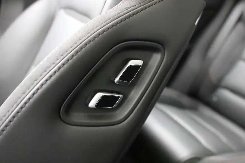 Спортивная стилистика оформления прослеживается и в салоне, в котором размещен руль со скошенной нижней частью и металлическими вставками. Широкий сенсорный монитор, установленный сверху центральной консоли, визуально объединен с цифровой панелью приборов за счет плавно изгибающегося козырька. Широкий трансмиссионный тоннель со стороны пассажирского кресла дополняется металлической конструкцией, которая выполняет декоративную функцию.