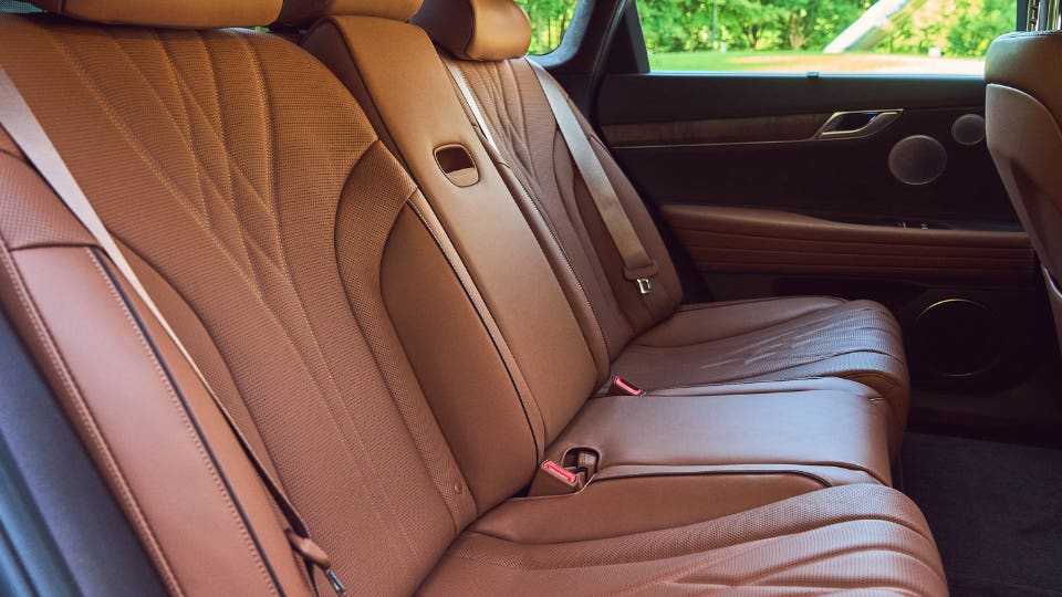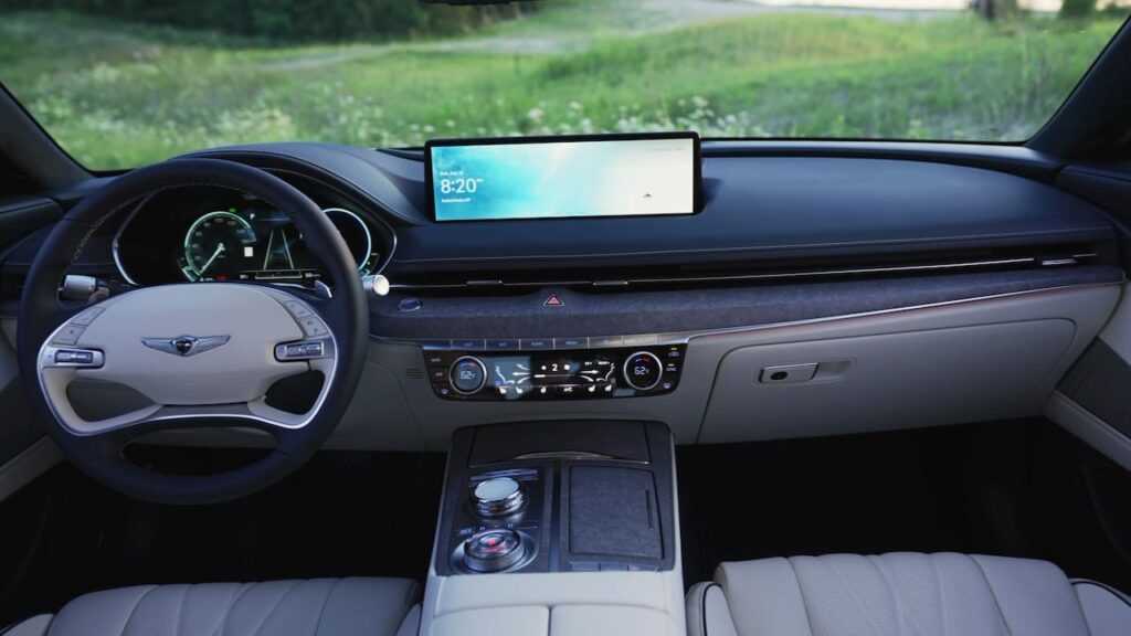 Эстетика роскоши продолжается и внутри. Electrified G80 имеет стандартную кожаную обивку Nappa с подогревом и вентиляцией передних сидений. Задние пассажиры получили откидной подлокотник с подстаканниками. Genesis также смелее подходит к выбору цвета и материалов, чем другие бренды класса люкс. Белая обивка нашего тестового автомобиля сочеталась с синей отделкой вместо обычной черной или серой, а также с матовой деревянной отделкой. Конечно, последний немного напоминал столешницы в закусочной на Лонг-Айленде.