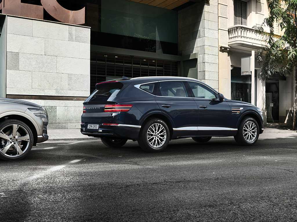 Большие колесные арки плотно прилегают к 19-дюймовым, 20-дюймовым или 22-дюймовым колесам из алюминиевого сплава (в зависимости от уровня отделки салона). Задняя часть GV80 перекликается с задними фонарями Quad Lamp, которые огибают углы автомобиля на задней двери. Двойные трапециевидные выхлопные патрубки той же формы, что и решетка радиатора, выступают из нижней задней панели. Качество покраски и отделки отличное, а зазоры между панелями однородные и плотные.