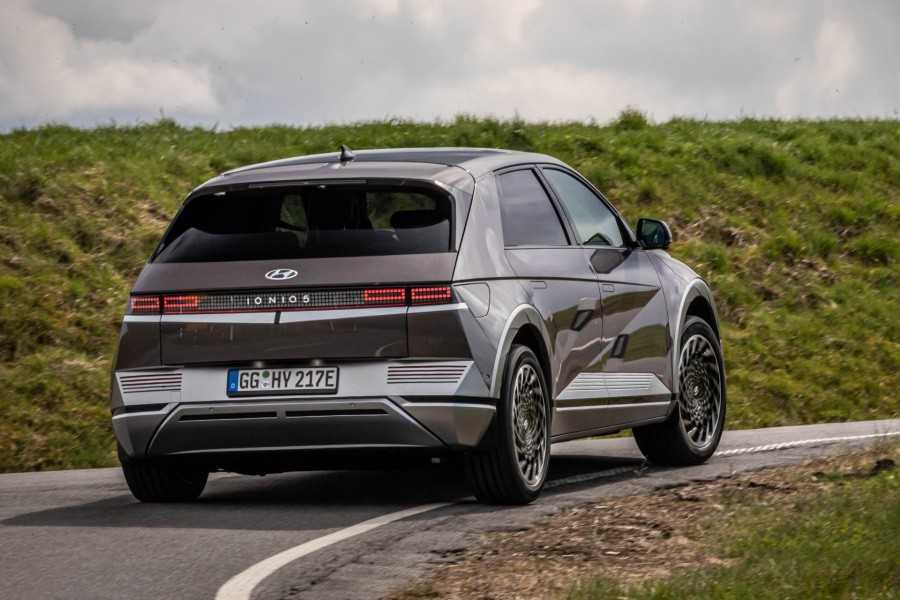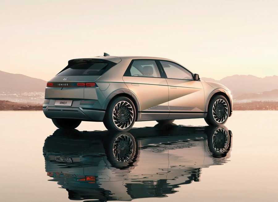Особого внимания заслуживают огромные аэродинамически выверенные 20-дюймовые колёсные диски. Это кстати самый большой размер колёс из тех, которые когда-либо устанавливались на электрокары марки Hyundai. Они превосходно дополняют идеально подобранные пропорции «пятёрки» и оптимизированы под архитектуру E-GMP. Диски такой размерности — принадлежность максимальных версий машины: с большой АКБ и полным приводом.