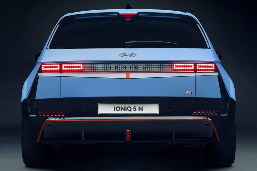 At the rear, the Ioniq 5 N sports a special wing-type spoiler with integrated triangular brake light, an exclusive black bumper cover with checker flag reflector graphics, an orange-accented rear diffuser, and vertical air outlets.