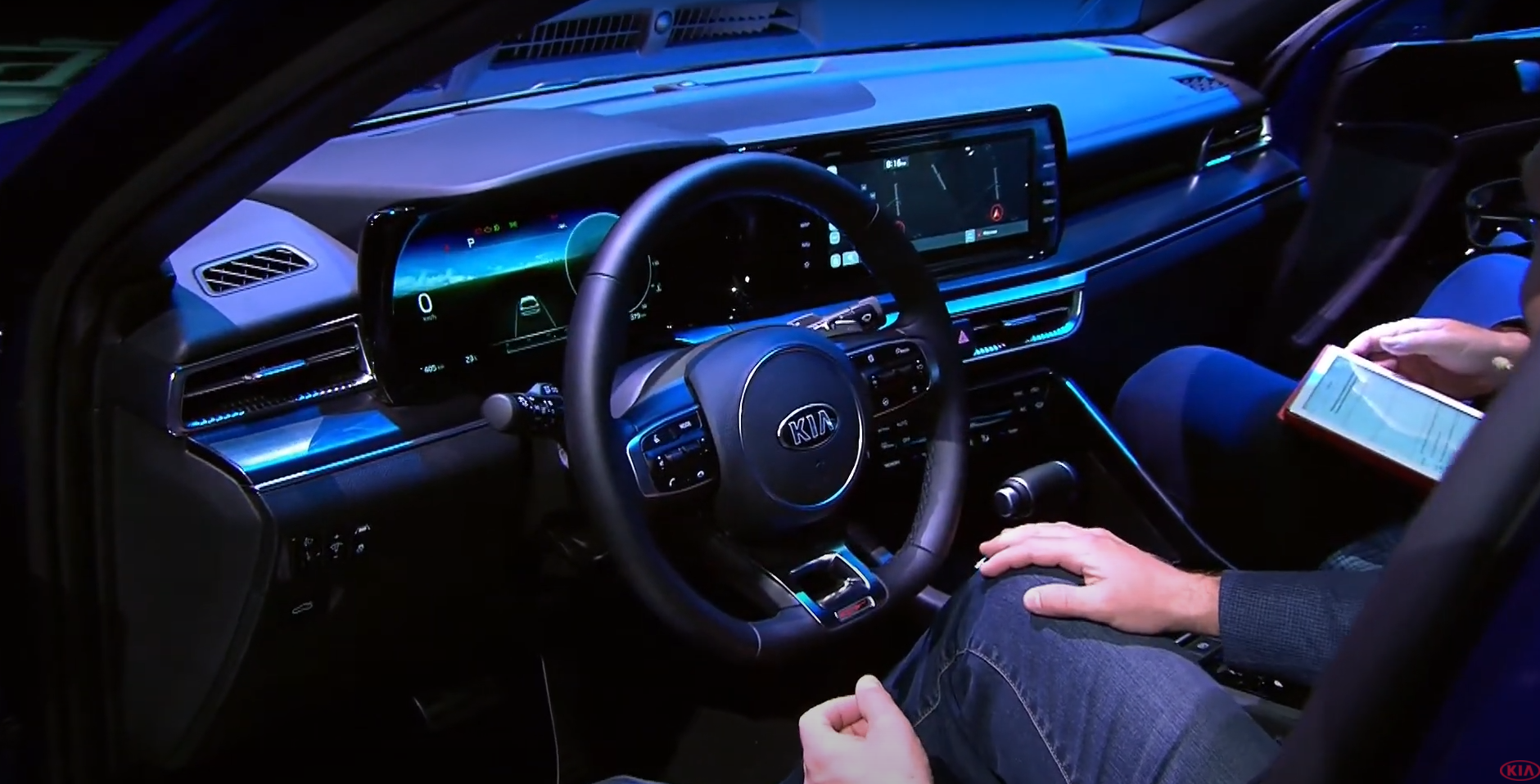 В салоне KIA K5 появилась цифровая приборная панель 12,3 дюйма и мультимедиа с экраном в 10,25 дюйма. Скошенное снизу рулевое колесо показывает легкий спортивный уклон модели.
