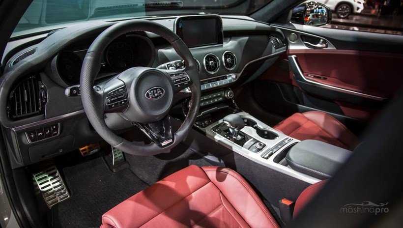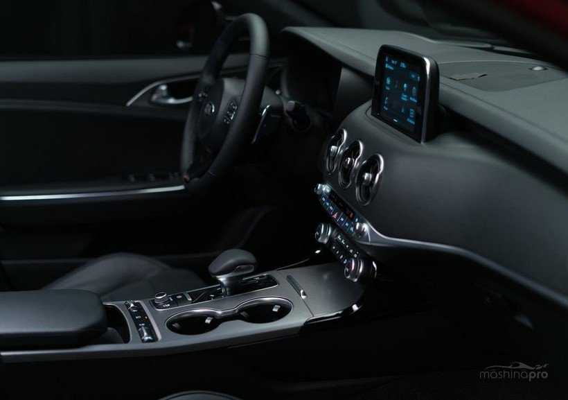 В ряд преимуществ авто Stinger 2017 входит высокоинформативная приборная панель, на которой присутствует бортовой компьютер и аналоговые циферблаты. Верхняя часть консоли обладает экраном головного устройства диагональю семь дюймов. Стоит отметить удобство расположения всех элементов управления, находящихся внутри кузова (фото представлено ниже).