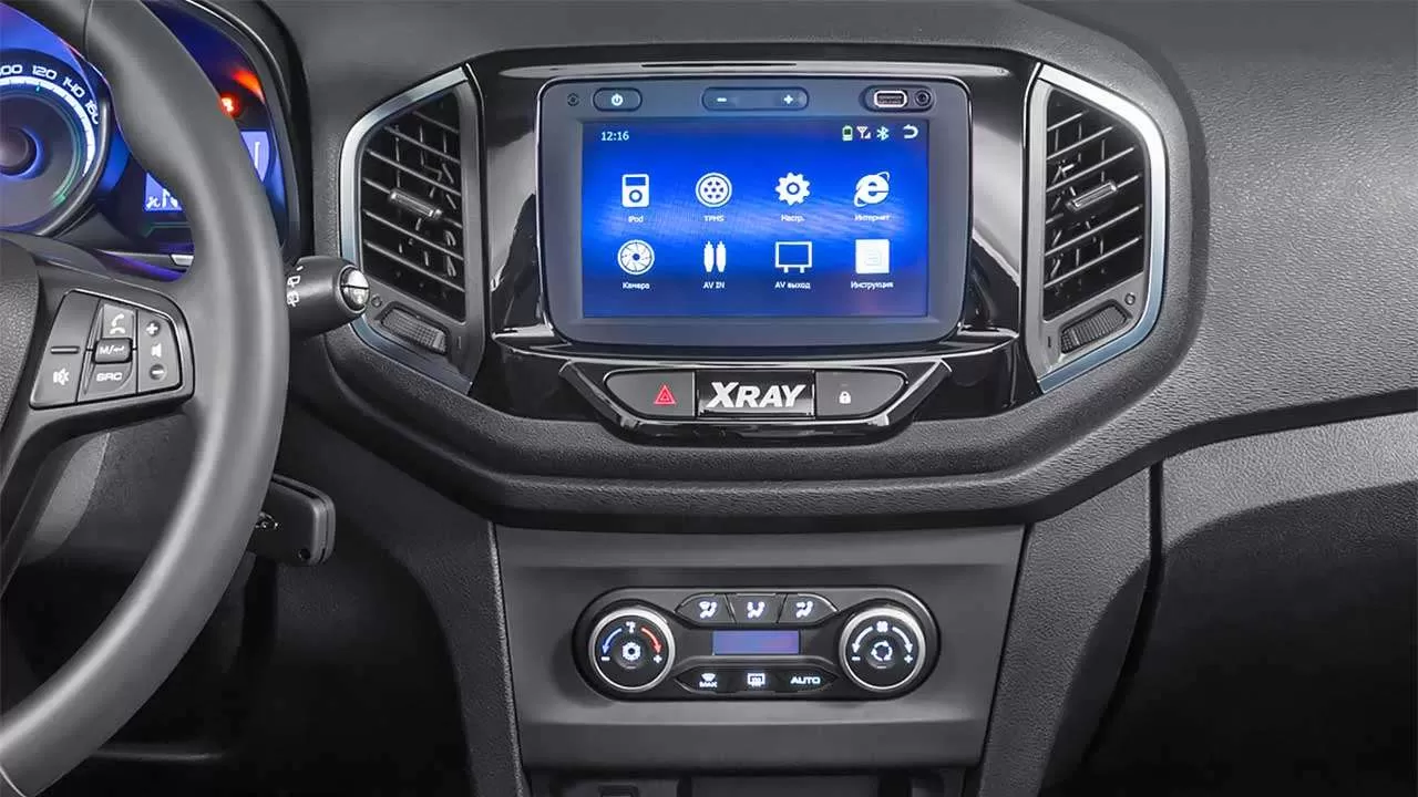 Интерьер Лады Xray выполнен в стиле минимализма: абсолютно ничего лишнего и никаких мириад кнопочек и тумблеров – все по делу. В центральной части консоли располагается дисплей бортового компьютера, который обособлен вентиляционными дефлекторами. По середине находится скромная панелька климат-контроля, имеющая минимальные размеры. На заднем фоне рулевого колеса мелькают «колодцы» приборов. «Четырехспицевый» руль совмещает в себе простоту и удобство, а в топовых версиях имеет элементы управления мультимедийной системой.