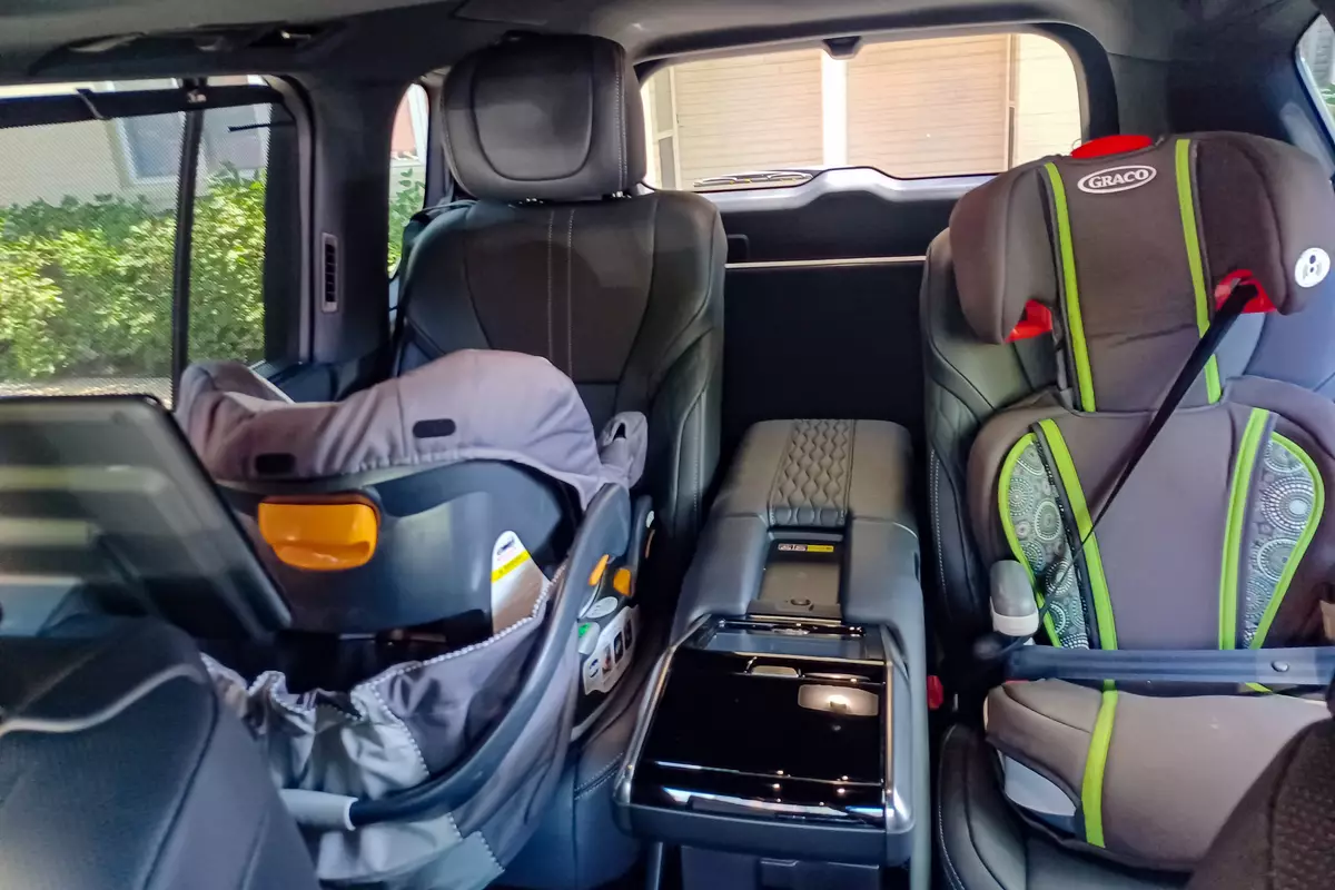 По иронии судьбы, однако, LX 600 в комплектации Ultra Luxury прекрасно вмещал автомобильные сиденья во время нашей проверки автомобильных сидений — но, очевидно, только два из них. Легкий доступ к нижним защелкам и анкерам верхнего троса упростил установку, а за передним пассажирским сиденьем достаточно места для ног, чтобы разместить даже детские кресла, обращенные назад, и трансформируемые сиденья.