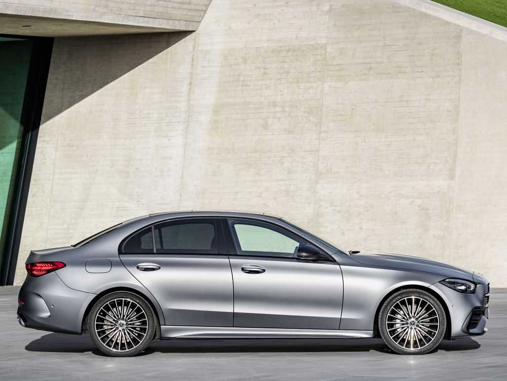 На фото в профильной проекции пятая версия Mercedes-Benz C-Class 2022 сохранила узнаваемые элементы брендовой седановской компоновки. В наличии: