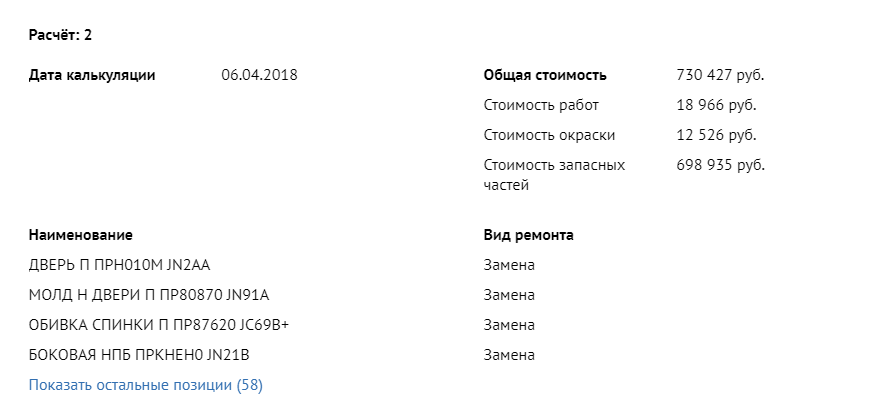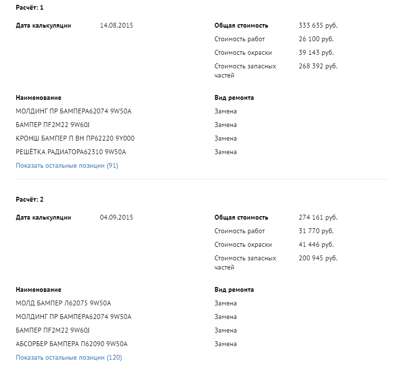 Помимо частой смены владельца, у машины есть и ДТП, и неоплаченные штрафы. Судя по страховым расчетам, стоимости восстановления также высокие, как и у первой проверяемой машины.