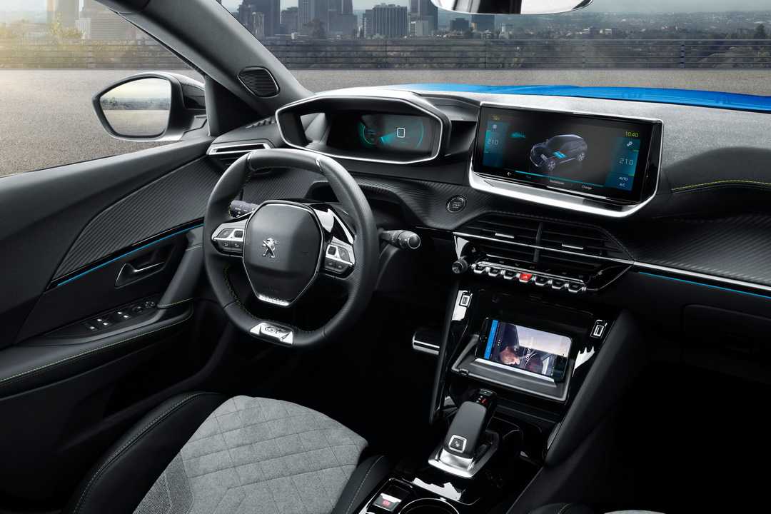 Интерьер также во многом позаимствован у 208-й модели. Попадая в автомобиль, пассажир будет встречен элементами, отделанными дорогими и качественными материалами. Детали, которые заметны меньше отделаны более дешевым пластиком. Некоторые детали интерьера прижились в марке давно и пришли еще с 206-й модели.