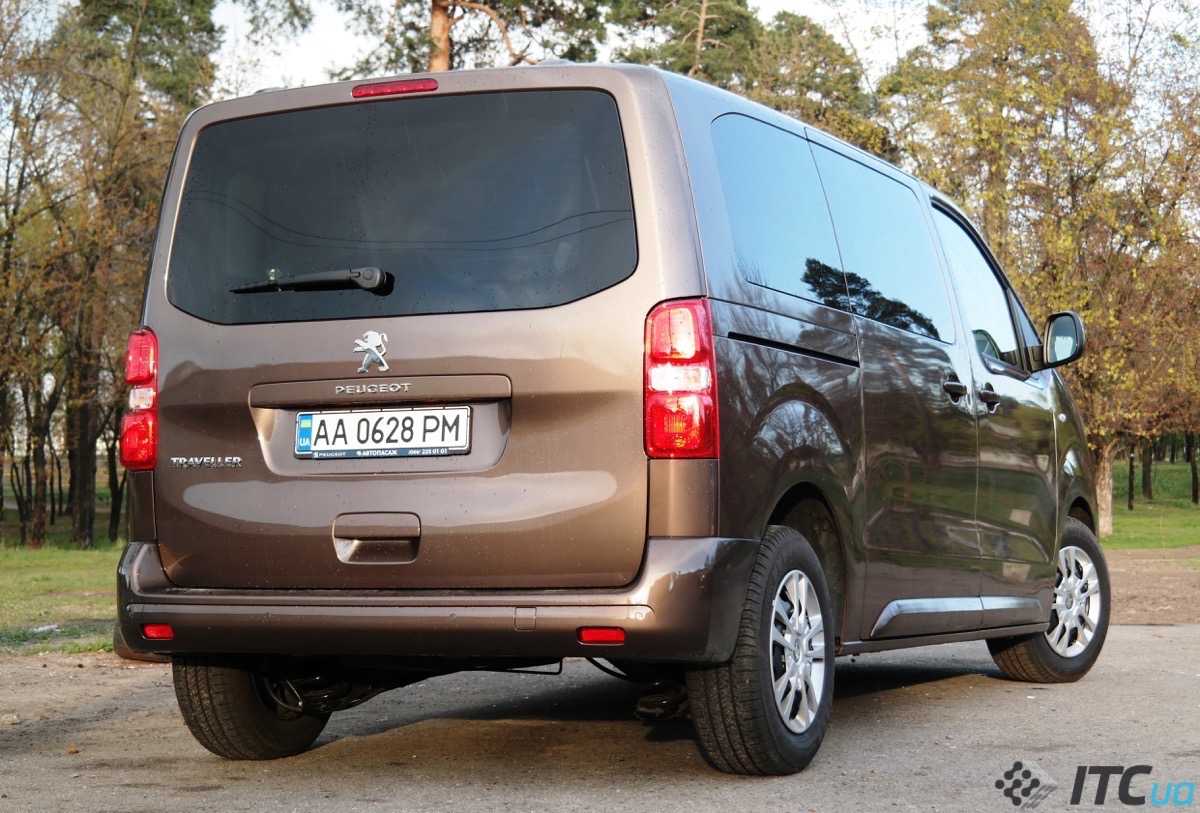 Кормовая часть также лишена изысков. Травеллер располагает огромной откидной дверью до пола, открывающей доступ во внушительный багажный отсек. Объем багажника – от 989-ти до 4554 литров. Этот показатель зависит от того, сколько пассажирских кресел в салоне. Вертикальные стоп-сигналы напоминают массу других моделей типа VW Transporter или брата-близнеца Citroen Space Tourer.