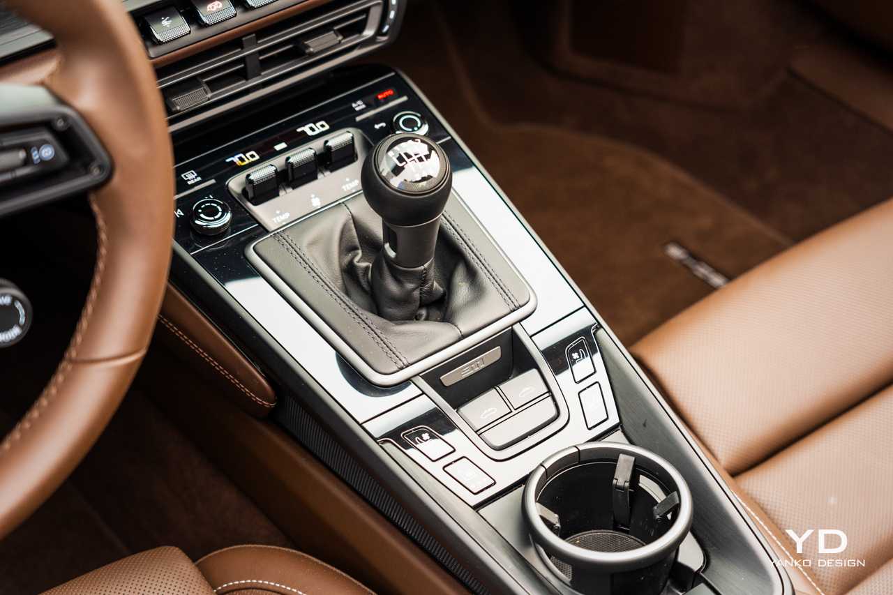 Весь основной функционал сосредоточен на разделительной тоннели. Компания Порше постоянно уточняет у своих клиентов что им нравится, а что нет, именно поэтому салон такой эргономичный. На старте тоннеле сосредоточены две шайбы, три джойстика и мониторы настройки раздельного климат-контроля. В центре тоннеля красуется новый вертикальный джойстик роботизированной коробки передач Порше 911 с дополнительными кнопками ниже. В конце тоннеля установлен огромный подстаканник, за которым кнопка стояночного тормоза. Подстаканник только один.