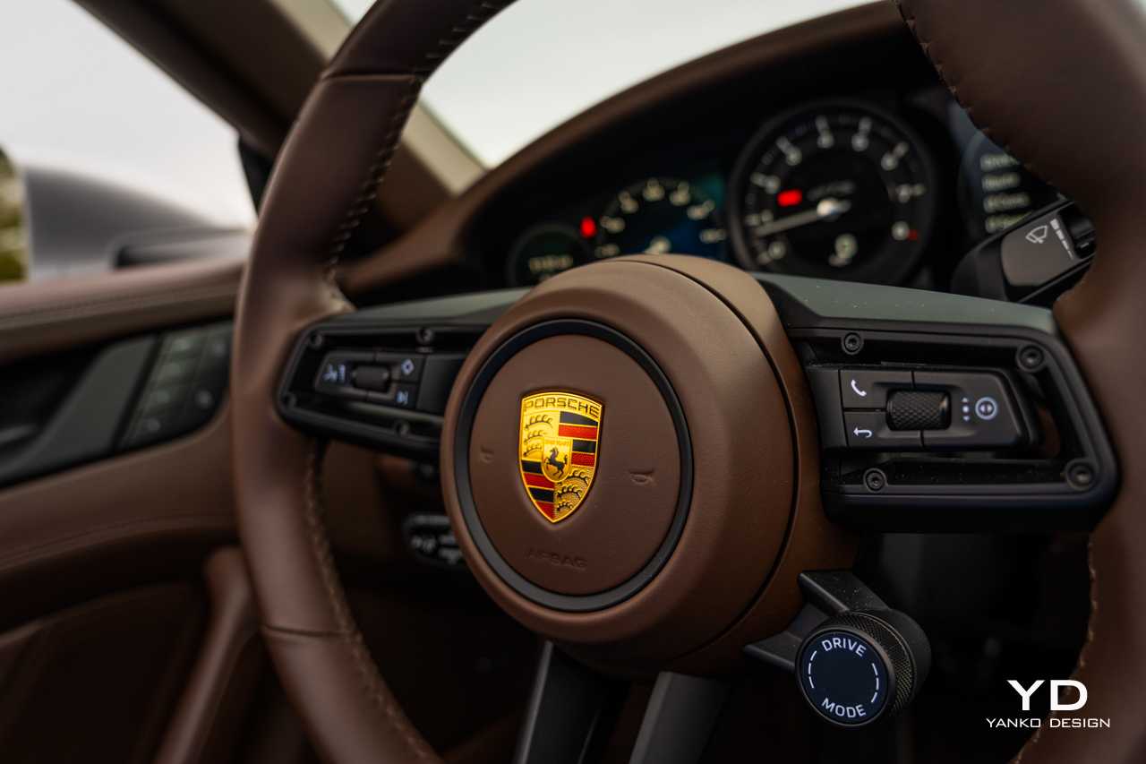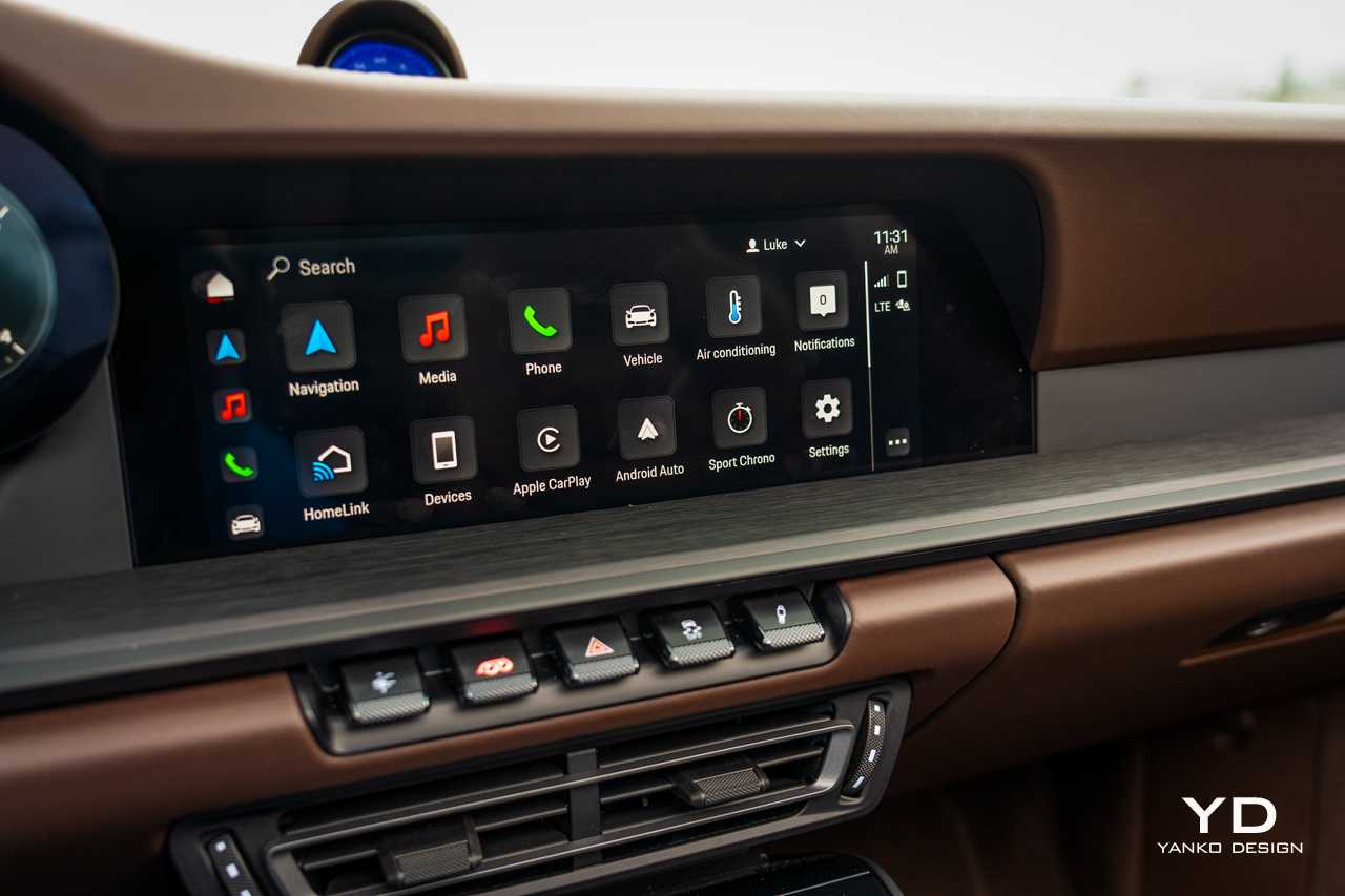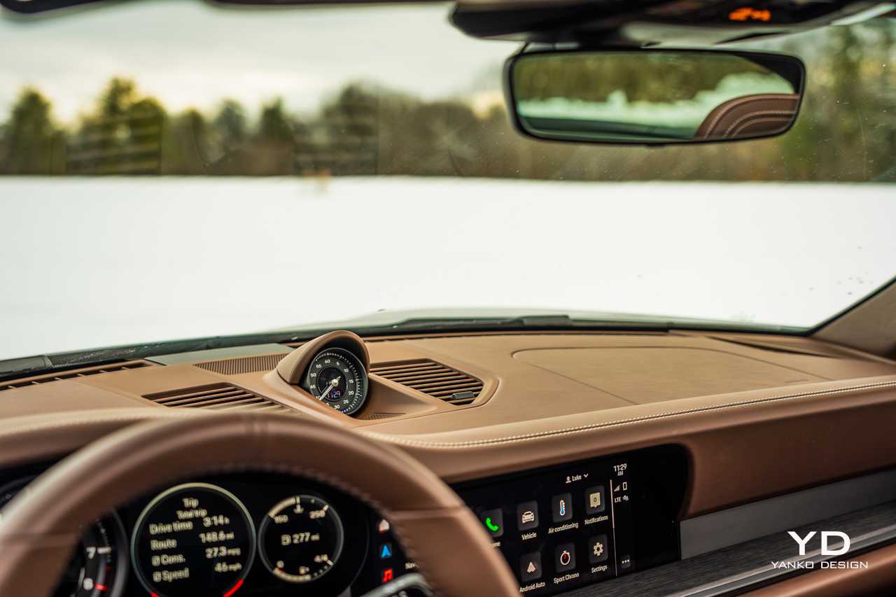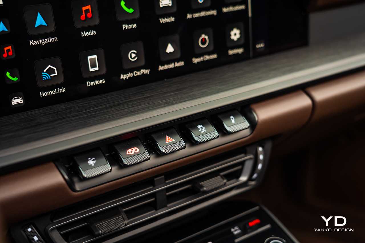 Центр внимая консоли – 10,9-дюймовый дисплей мультимедиа, значительно увеличившийся в сравнении с предшественником Porsche 911. Функционал мультимедии то же изменился, это не просто прирост размера. Дисплей утоплен в панель торпедо, оснащенной декоративными планками Diamar. Наверху панели торпедо аналоговые часы. Под дисплеем джойстики управления разным функционалом безопасности.