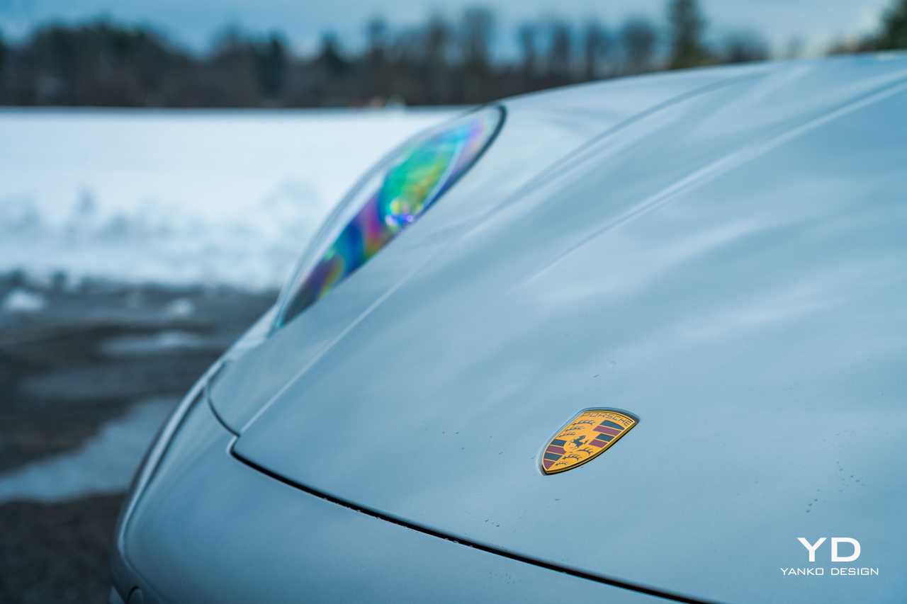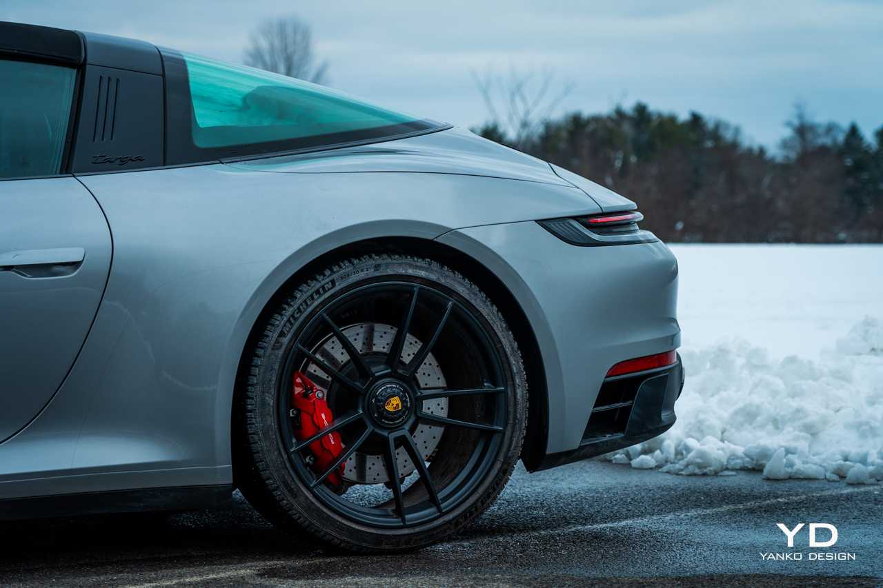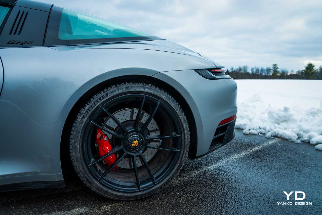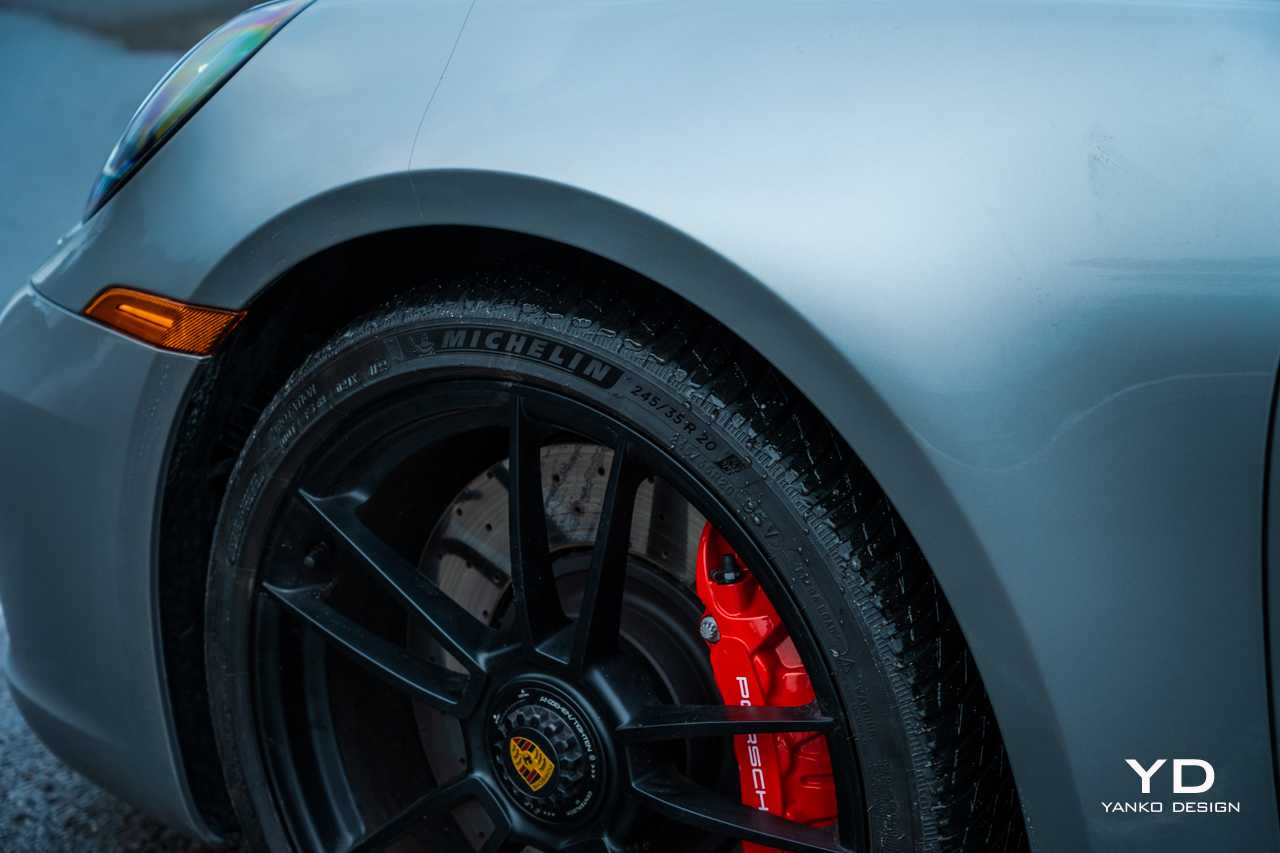 Сбоку отличить новинку от прошлого 991 кузова практически невозможно. Здесь те же плавные линии с огромным раздутием задней колесной арки нового Porsche 911. Изменилась дверная ручка, технически она такая же, приподнимающаяся вверх, но ее сильно углубили в кузов для аэродинамики, поэтому при подходе к автомобилю ручки выезжаю для комфортного открытия. Технология примерно похожая на Теслу и Range Rover Velar. Установлена резина разного диаметра для лучшего зацепа на старте, спереди – 20-дюймовые, сзади – 21-дюймовые.