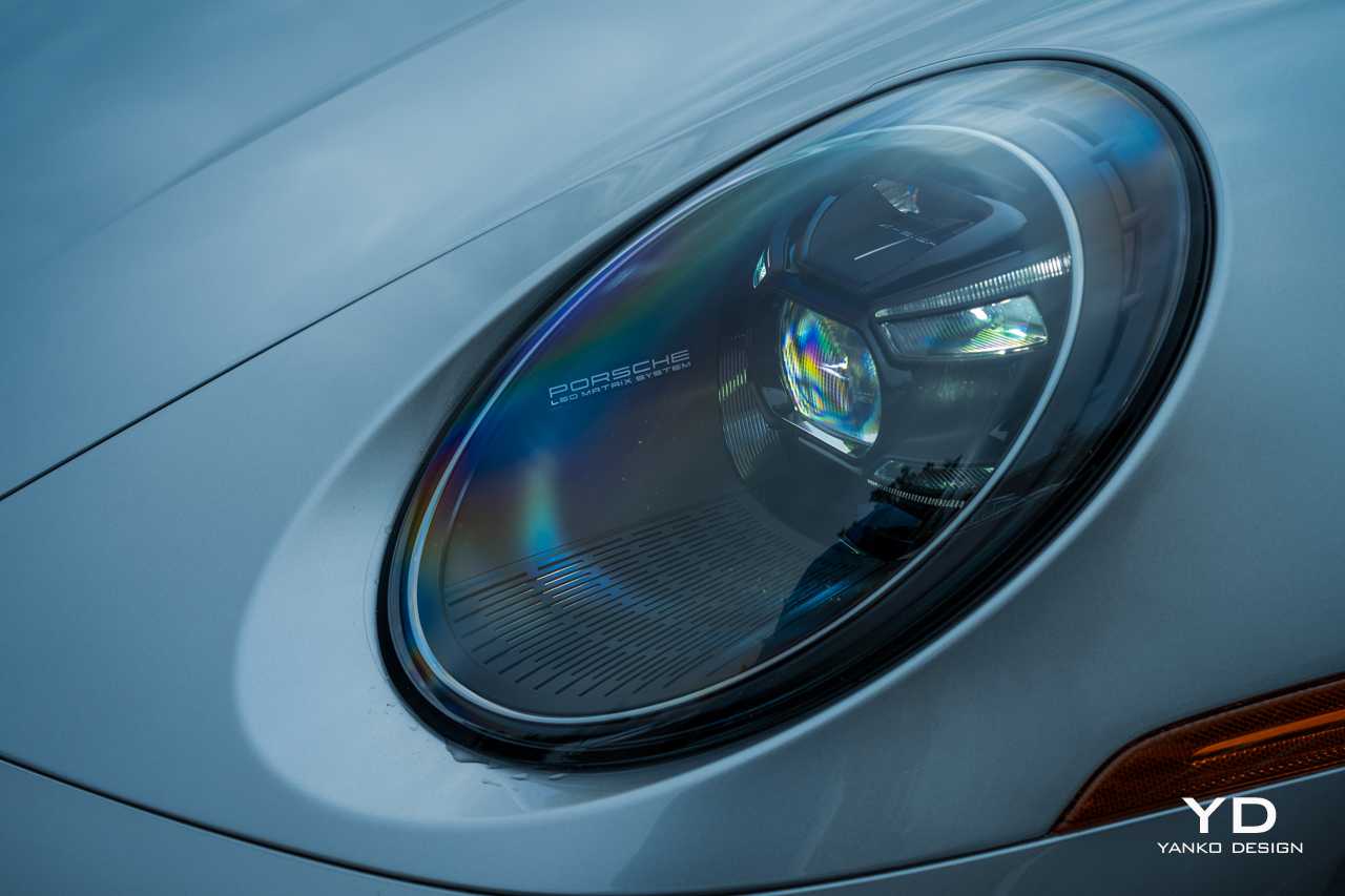 Спереди купе 911 получило фирменную подкорректированную овальную оптику LED Matrix с 4-точечными фонарями ближнего света. Между фар большая крышка багажника с двумя в центре приподнятыми агрессивными аэродинамическими линиями. Все датчики и камеры систем безопасности немецкий производитель установил под фары, их не видно, что радует. На новом массивном бампере вставлены тонкие сигналы поворота, под которыми огромные воздухозаборники с черными плашками направления воздуха.