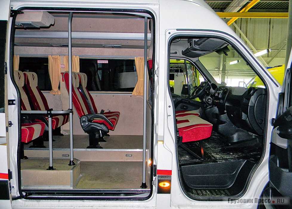 Помимо эргономики Master готов предложить впечатляющий комфорт. Водительское сиденье оснащается удобными механизмами регулировки положения по горизонтальному уровню и наклону спинки. Похвалы заслуживает и мягкая подвеска кресла. Это очень кстати, ведь жесткие повадки рамного шасси на плохой дороге могут здорово досаждать позвоночнику. Пассажирских мест спереди сразу два. Центральное вдобавок оснащено потолочной ручкой.