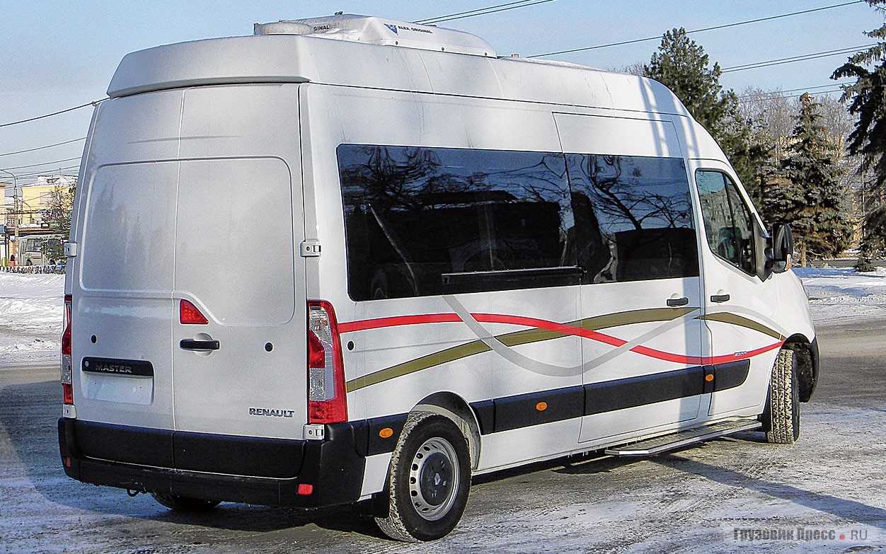 Под переоборудование был выбран наиболее вместительный переднеприводный фургон с колесной базой 4332 мм и внутренней высотой фургона 2144 мм, из которого получился довольно уютный и комфортабельный туристский автобус, рассчитанный на 14 пассажиров. По некоторым элементам, конечно, видно, что машина сделана на скорую руку (за неделю до выставки «МАФ’2011»), но класс переоборудования виден невооруженным взглядом. Например, в багажные полки интегрированы модные светодиодные светильники, в бархатистую ткань убраны не только пассажирские кресла, но и водительское, кондиционер имеет индивидуальную разводку для водителя и каждого пассажира, а все металлические панели скрыты под светло-бежевым кожзаменителем. Несмотря на наличие кондиционера, «Мастер» оборудован люком в крыше и двумя форточками в боковых стеклах.