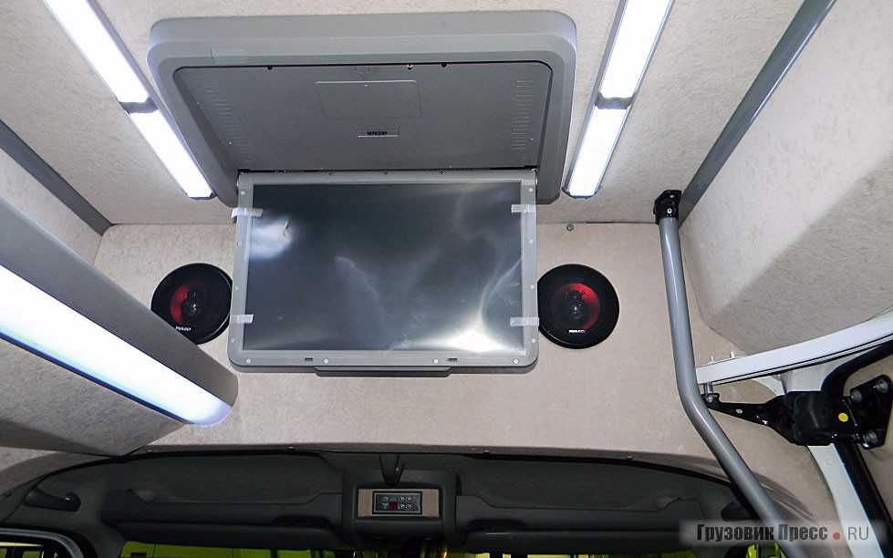 Несмотря на то, что это туристский автобус, производитель не поскупился на установку поручней на входе в салон. Есть там и 17-дюймовый ж/к монитор с DVD-проигрывателем и 6 динамиками, расположенными по всему периметру салона.