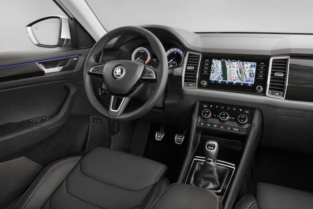 Внутреннее убранство салона выглядит элегантно и достойно. Передняя панель с большим количеством изящных деталей и плавных очертаний дизайнерских атрибутов. Приборный щиток весьма скромный. Перед водителем обычное расположение устройств управления, установленных 2-мя рядами циферблатов в хромированном обрамлении. Мультифункциональный руль имеет спортивный вид. Консоль по центру с 8-ми дюйм. сенсорным дисплеем, который окружают 2 дефлектора. Раздельным блоком вынесены клавиши, устройства управления системой климата, круиз-контроля и мультимедиа системой. Мультимедиа с опцией навигации, есть возможность выхода в интернет, поддержкой флеш-карт с памятью до 64-х Gb, возможность подключения Apple либо Андроид. Внутреннее пространство весьма просторное. В интерьере имеются множество хромированных накладок, создающих великолепную, спортивную внешность. По умолчанию обновленная марка Skoda Kodiaq производится в 5-ти местном варианте. Кресла спереди отлично сконструированы, они глубокие, с хорошей боковой поддержкой и с множеством различных эл. регулировок.