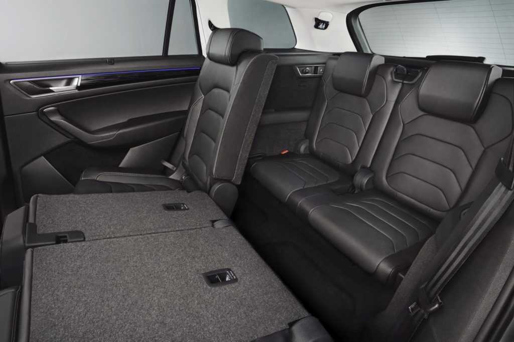 Увеличенные габариты и расстояние между колесными осями положительно сказались на просторности салона Skoda Kodiak с новым кузовом. В дополнение к комфортному размещению пассажиров второго ряда, теперь можно добавить третий ряд сидений для людей ростом до 180 см. В то же время средний ряд можно регулировать в продольном направлении в пределах 18 см, что позволяет эффективно использовать полезное пространство. Заявленный объем багажника для 5-местной модификации варьируется от 720 до 2065 литров. Кроме того, сообщается о способности перевозить длинные суда длиной до 2,8 метра. Не забыты и геометрические ходовые качества: в технических характеристиках указан дорожный просвет 194 мм.