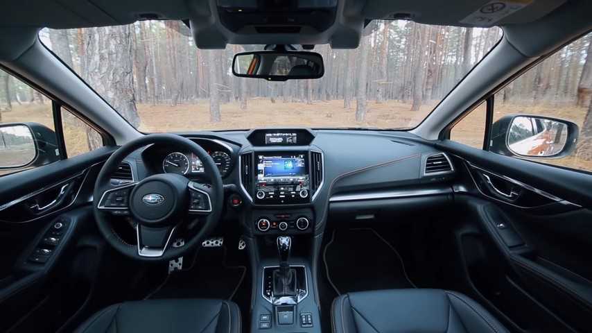 Интерьер Subaru XV выполнен в чёрно-серебристых тонах, которые несколько оживляет красная прострочка на руле, креслах, дверных ручках и рычаге коробки переключения передач.