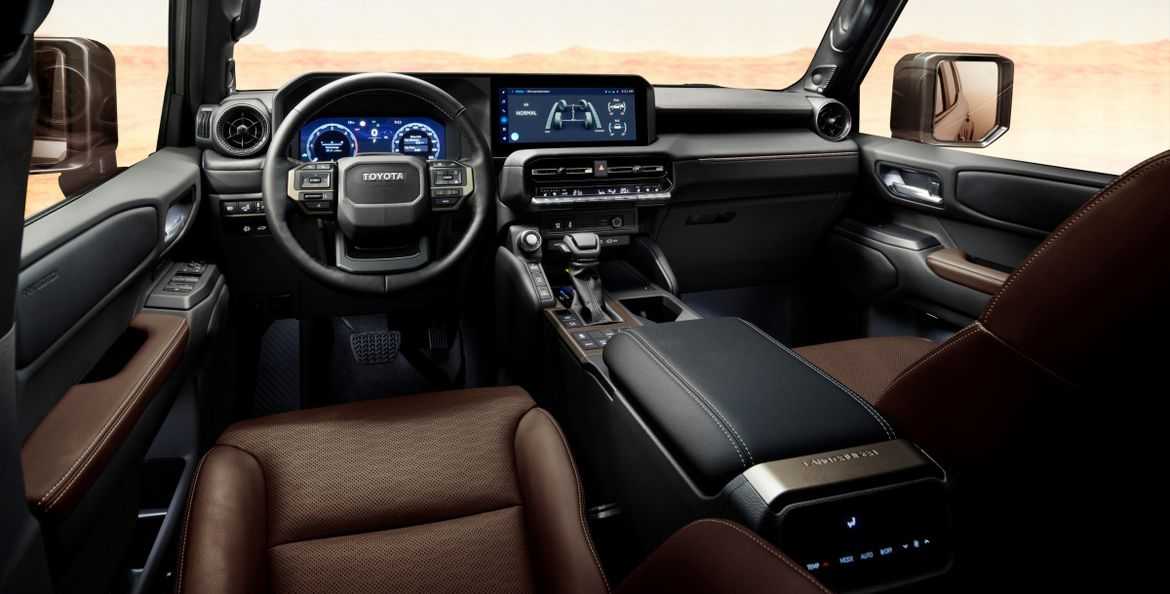 По габаритам (4925 x 1980 x 1870 мм; колесная база 2850 мм) новый Prado стал на 100 мм длиннее, на 95 мм шире и на 20 мм выше предшественника; колесная база удлинилась на 60 мм. Автомобиль в итоге стал просторнее внутри; как и прежде, будут доступны 5- и 7-местная конфигурации салона. Стилистически интерьер Prado 2024 модельного года оформлен в духе нового Lexus LX.