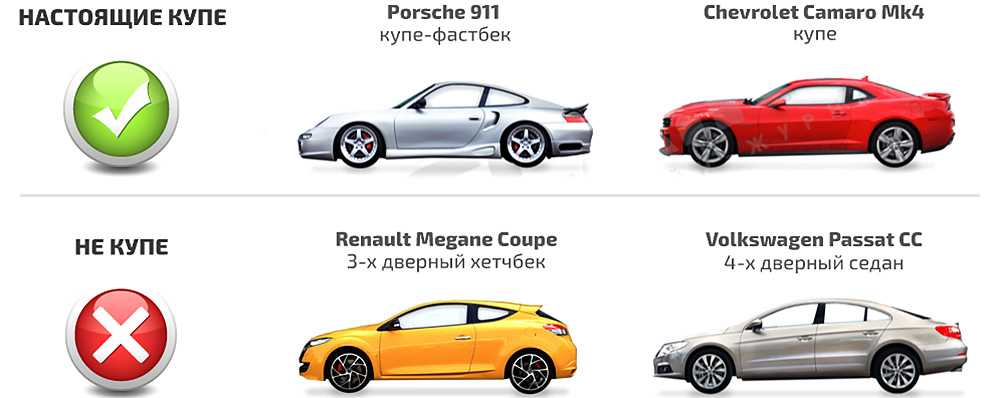 «Купе» от «седана» отличает только то, что автомобиль в кузове типа «купе» имеет всего две двери. На французском языке «купе» означает «отрезать». Эти авто строят на базе седана для спортивных версий, они имеют двигатель большой мощности и, обычно, меньшую высоту.