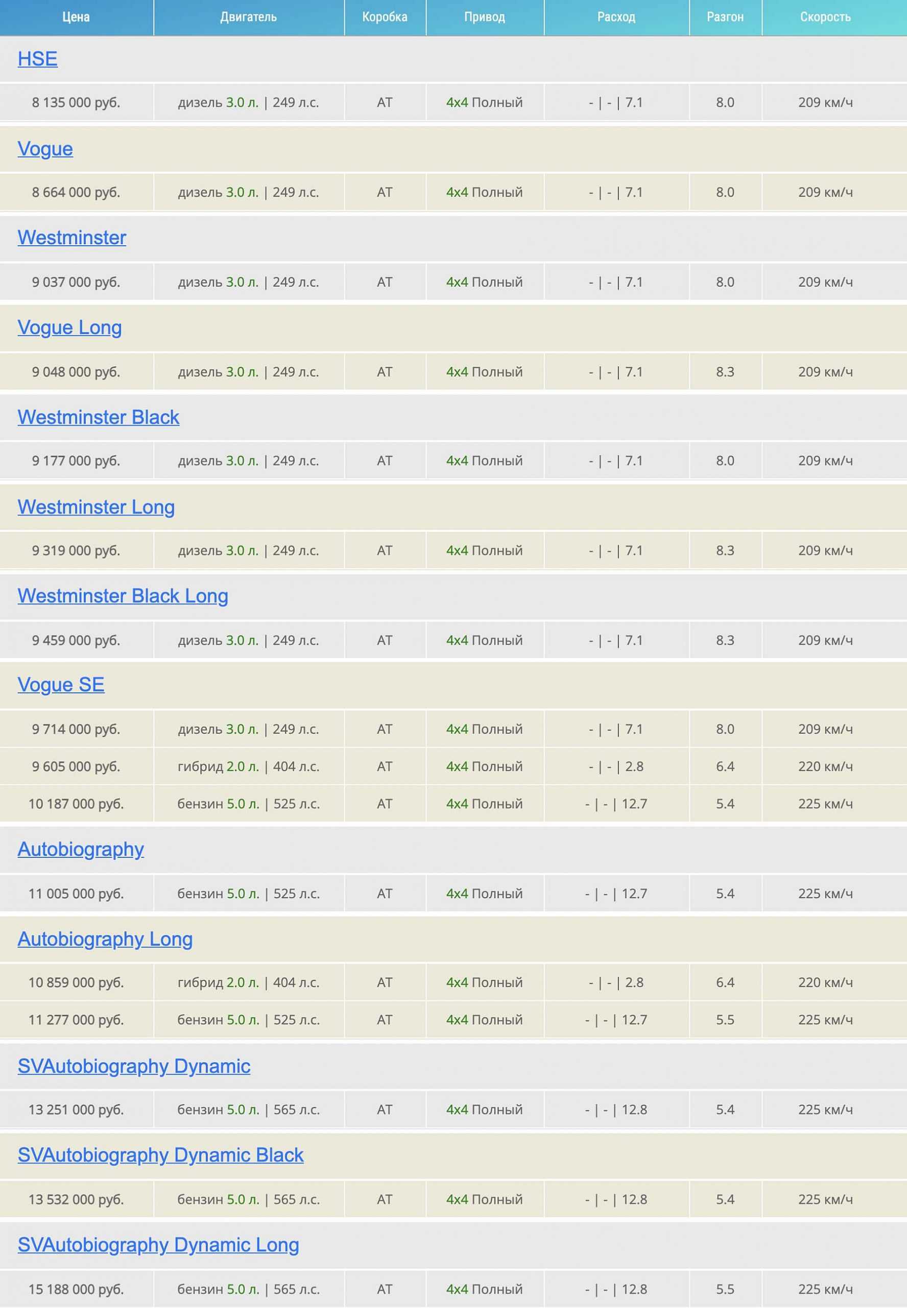 Начнём с Range Rover со стандартной колёсной базой. Предлагаются такие комплектации: