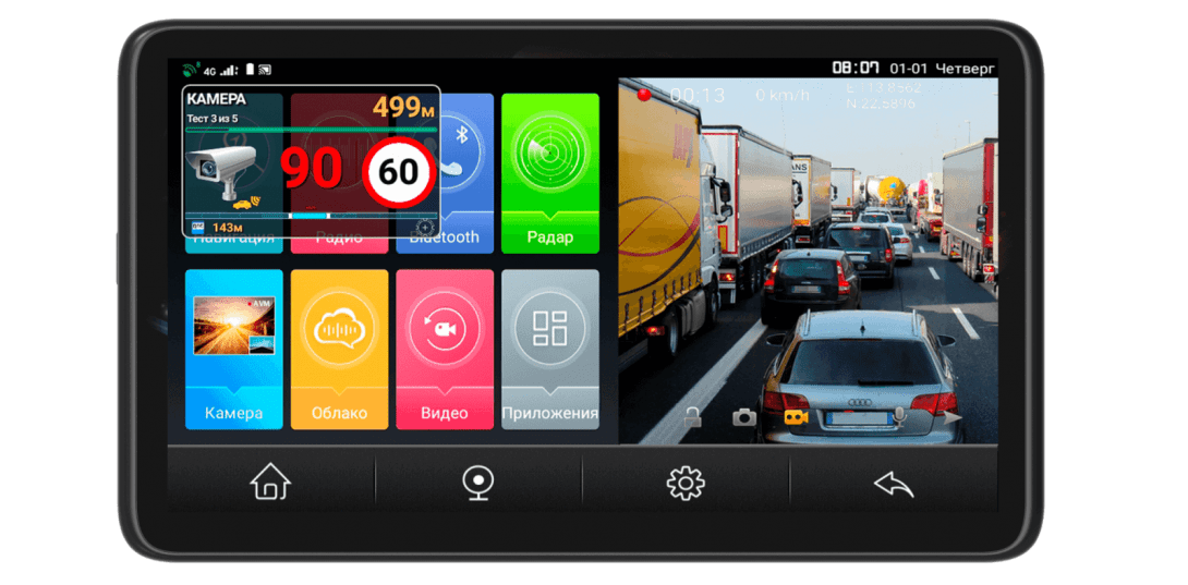 Отдельно радарный модуль не установлен – его функции выполняет GPS система. Она находит камеры, радары по пути следования автомобиля, чтобы сообщить о них водителю. Подобрать оптимальную программу навигации можно в магазине приложений. Оповещение о скоростных системах доступно с дистанции до 2,5 км.