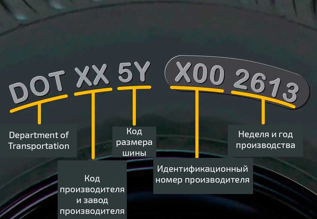 DOT — шина соответствует американским стандартам качества (Department of Transportation— Министерство транспорта США), следом за обозначением DOT идет цифровой код, в котором зашифрованы завод-изготовитель, пресс-форма и партия производства