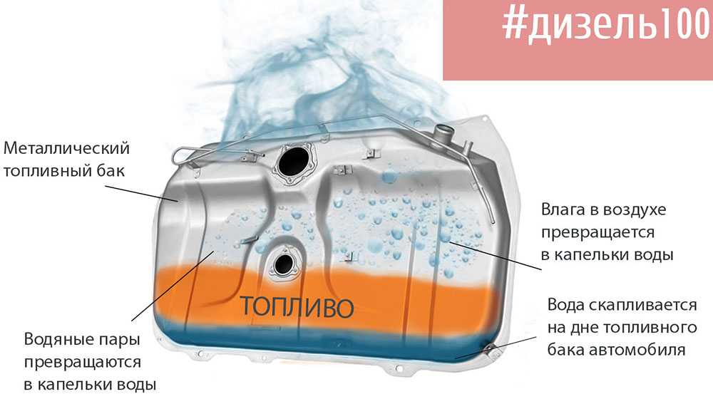 После определения проблемы возникает логичный вопрос по поводу её причины: как же вода там появилась? Жидкость может попадать разными путями. Наиболее частый и актуальный в северных странах путь — это конденсат в баке, то есть последствие перепадов температуры, например, при заезде зимой в тёплый гараж. Больше всего он образуется на металлической поверхности за счёт высокой теплопроводности материала. То же самое происходит и из-за повышенной влажности воздуха или из-за тумана.