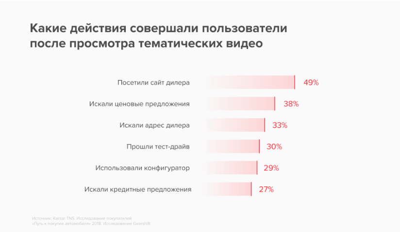 myTarget подтверждает рост влияния онлайн-видео на покупку и пишет, что 94% пользователей после просмотра роликов совершили как минимум одно действие, влияющее на решение о покупке, чаще всего это было посещение сайта автодилера (49%).