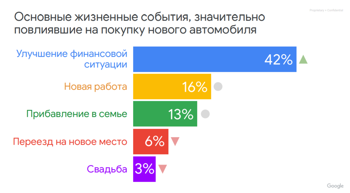 По данным, которые Google представил на конференции Think Auto 2019, чаще всего решаются на покупку машины те, у кого произошло улучшение финансовой ситуации (42%), а также люди, получившие новую работу (16%). На третьем месте те, у которого появились дети (13%).